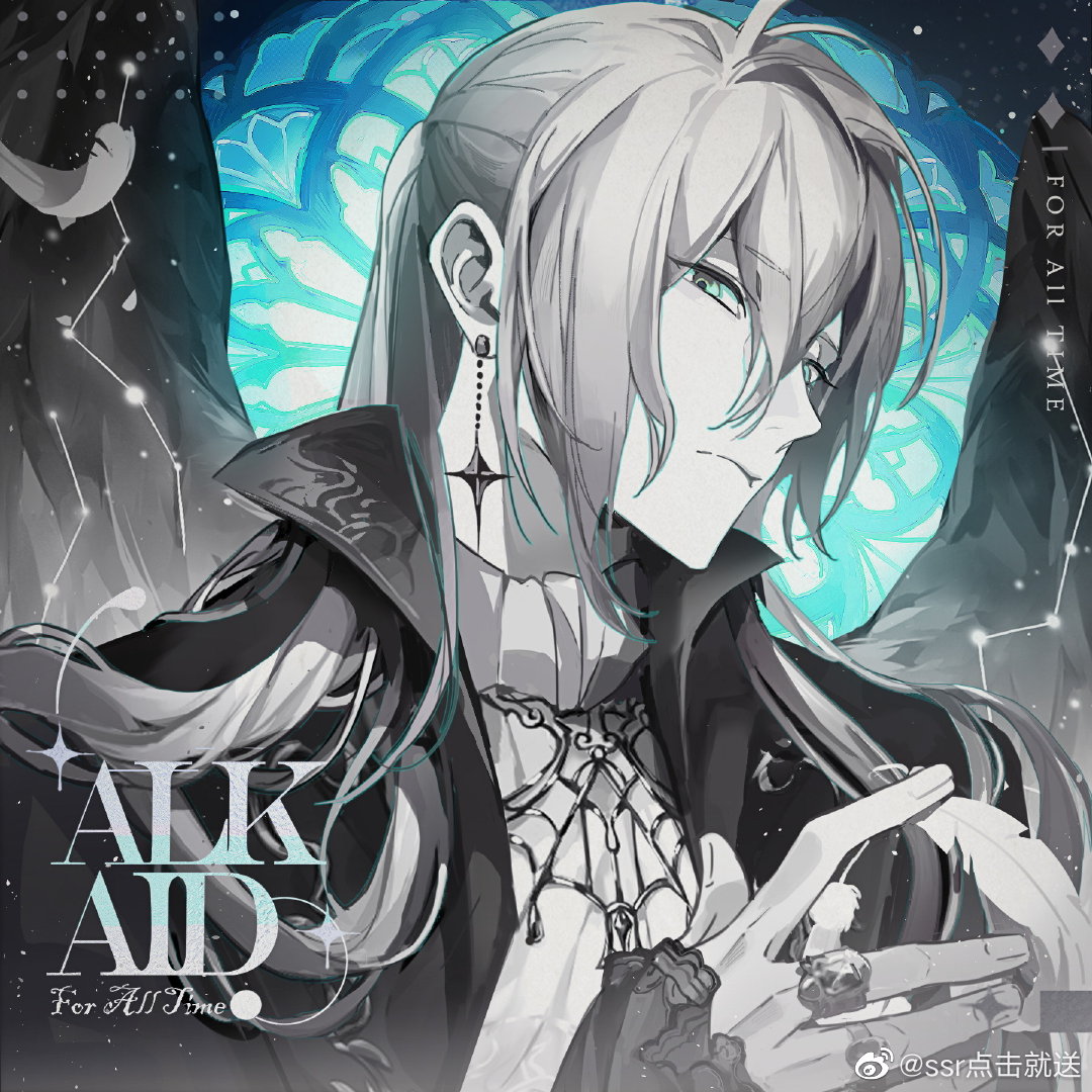 1boy alkaid_mcgrath alkaid_mcgrath_(until_the_end_of_time) angel_wings ascot character_name closed_mouth constellation copyright_name earrings falling_feathers feathered_wings feathers floating_earrings greyscale hair_between_eyes half_updo jacket jewelry long_hair long_sleeves looking_at_viewer lovebrush_chronicles male_focus monochrome official_alternate_costume official_art ring sidelocks sideways_glance sleeves_past_wrists solo spot_color ssr_dianji_jiu_song stained_glass star_(symbol) star_earrings upper_body watermark weibo_watermark wings