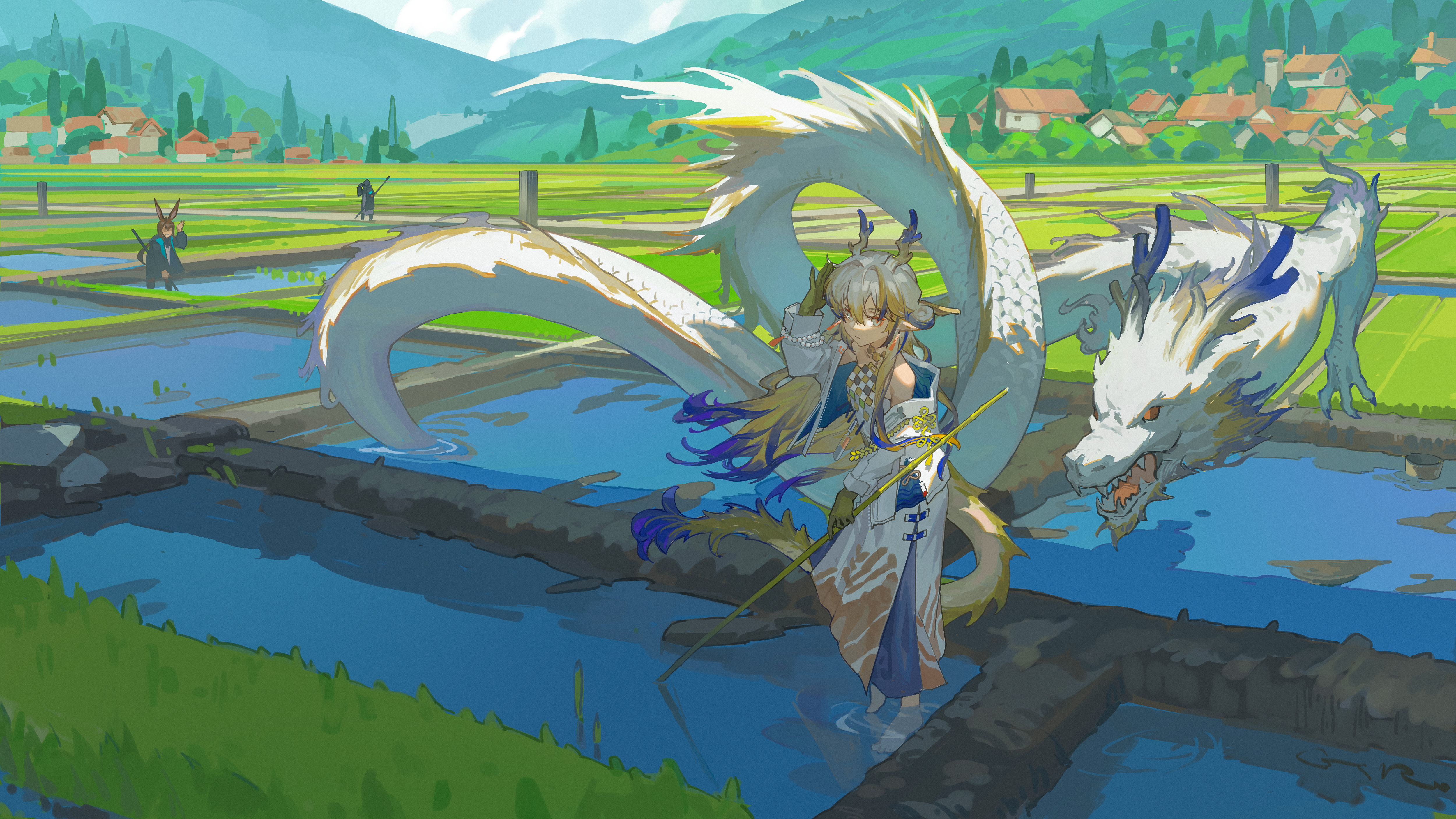 1other 2girls absurdres amiya_(arknights) arknights arm_up bare_shoulders barefoot beads black_coat black_jacket blonde_hair brown_hair chinese_commentary coat commentary_request day doctor_(arknights) dragon dragon_girl dragon_horns dragon_tail earrings eastern_dragon fantasy farm grass grey_eyes grey_hair grey_horns hair_between_eyes hand_in_own_hair hand_up highres holding holding_stick hood hood_up hooded_coat horns house jacket jewelry long_hair long_skirt long_sleeves looking_back mountain multicolored_hair multiple_girls necklace off_shoulder open_clothes open_jacket outdoors parted_lips pointy_ears purple_hair purple_horns purple_tail rice_paddy rui_(gsr1982) rural shu_(arknights) skirt standing stick strapless sunlight tail tree tube_top village wading water waving white_jacket white_skirt white_tube_top wide_shot yellow_tail