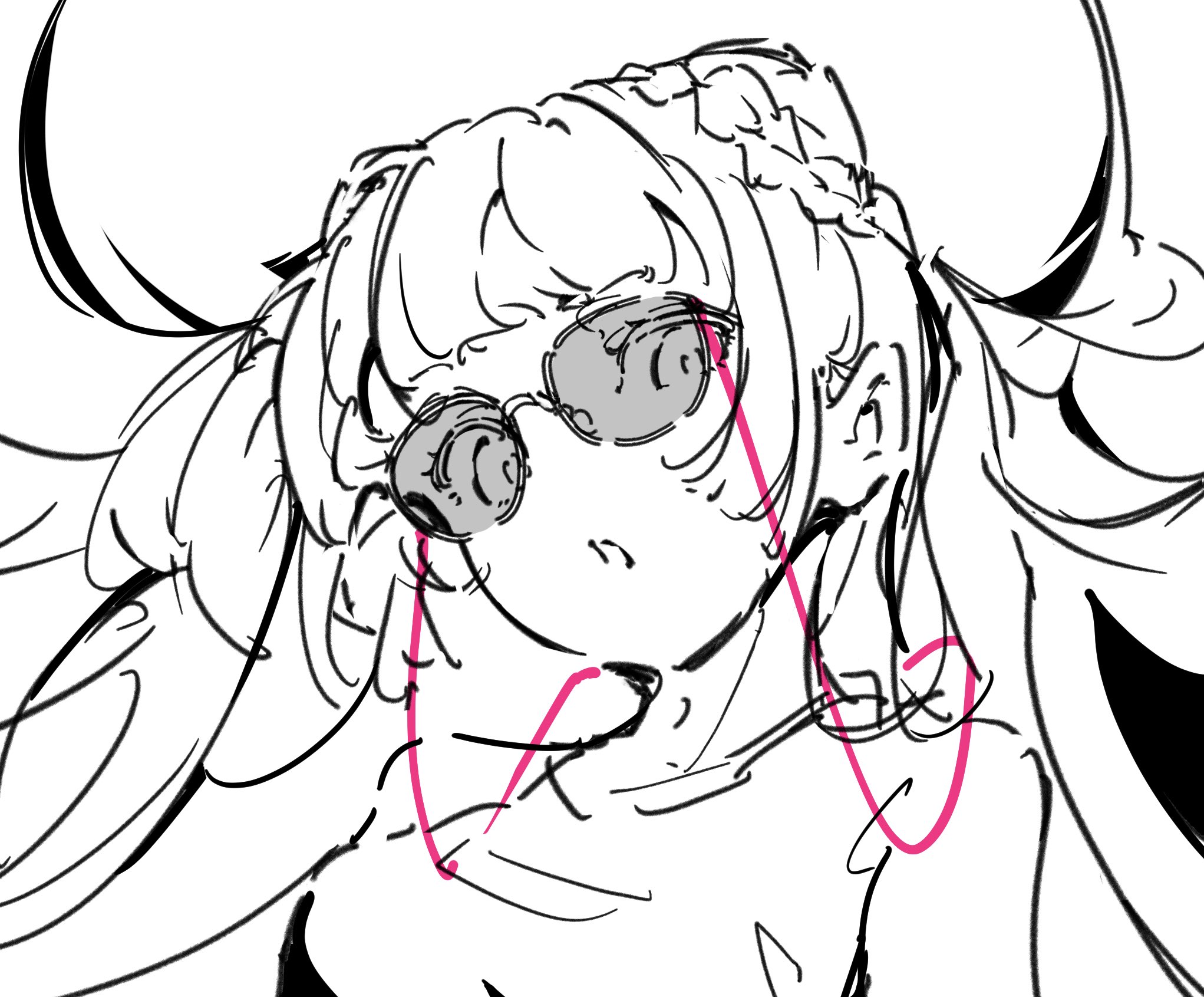 1girl atenaba ch4nge_(cevio) greyscale highres kafu_(cevio) long_hair looking_at_viewer monochrome parted_lips shirt sleeveless sleeveless_shirt solo spot_color sunglasses twintails upper_body