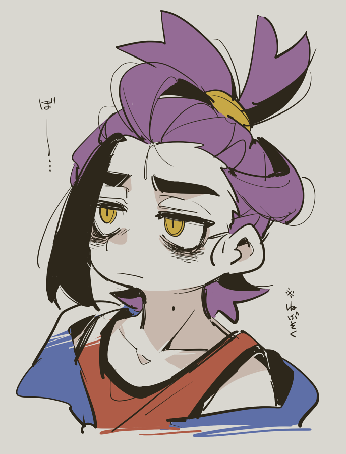 1boy bags_under_eyes black_hair blue_jacket collarbone commentary_request frown hair_tie hair_tied hair_up hairband jacket kieran_(pokemon) looking_to_the_side loose_hair_strand lunchbox_(artist) male_focus mole mole_on_neck multicolored_hair nintendo off-shoulder_jacket off_shoulder pokemon pokemon_scarlet_and_violet ponytail purple_hair red_tank_top shirt short_hair simple_background tank_top two-tone_hair upper_body white_background yellow_eyes