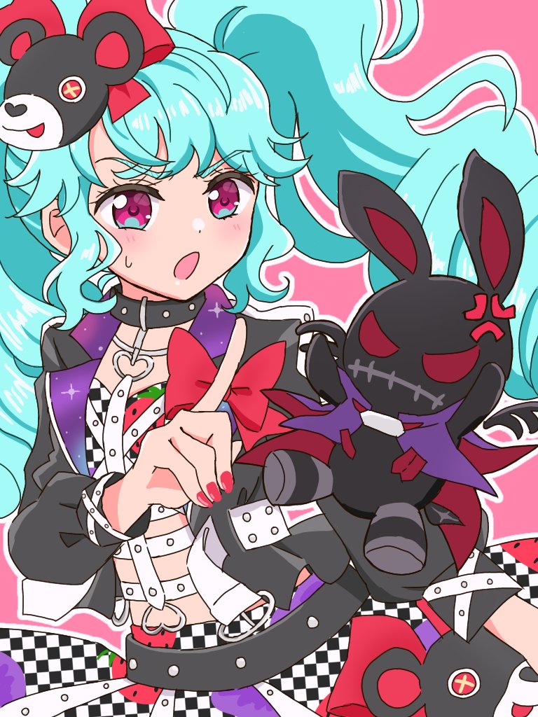 1girl :o anger_vein black_collar black_jacket blue_hair checkered_clothes checkered_skirt chest_harness collar commentary_request cowboy_shot hand_up harness idol_land_pripara index_finger_raised jacket katasumi_amari long_hair long_sleeves looking_at_another mario_(pripara) mario_(rabbit)_(pripara) nail_polish open_mouth pink_eyes pretty_series pripara rabbit shiono_(shio_caramel_no) skirt standing sweatdrop twintails