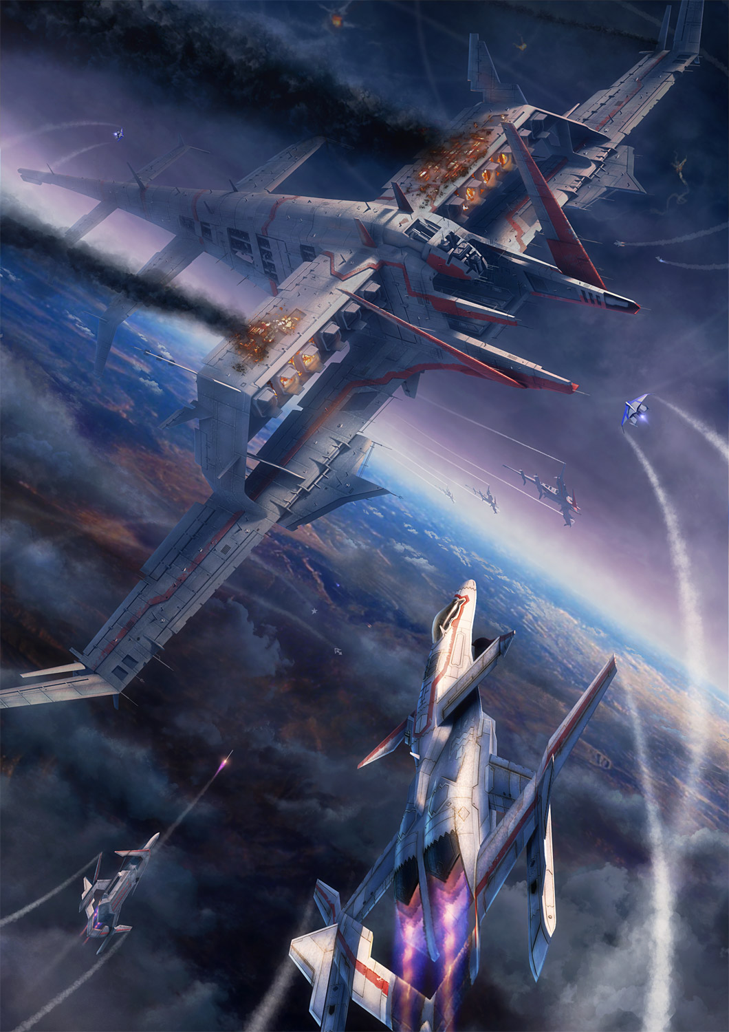1boy aerial_battle aircraft airplane battle carrier cloud contrail explosion fighter_jet fire fleet grand_scale highres mecha military military_vehicle missile original pinakes pinax planet realistic robot science_fiction smoke vehicle_focus