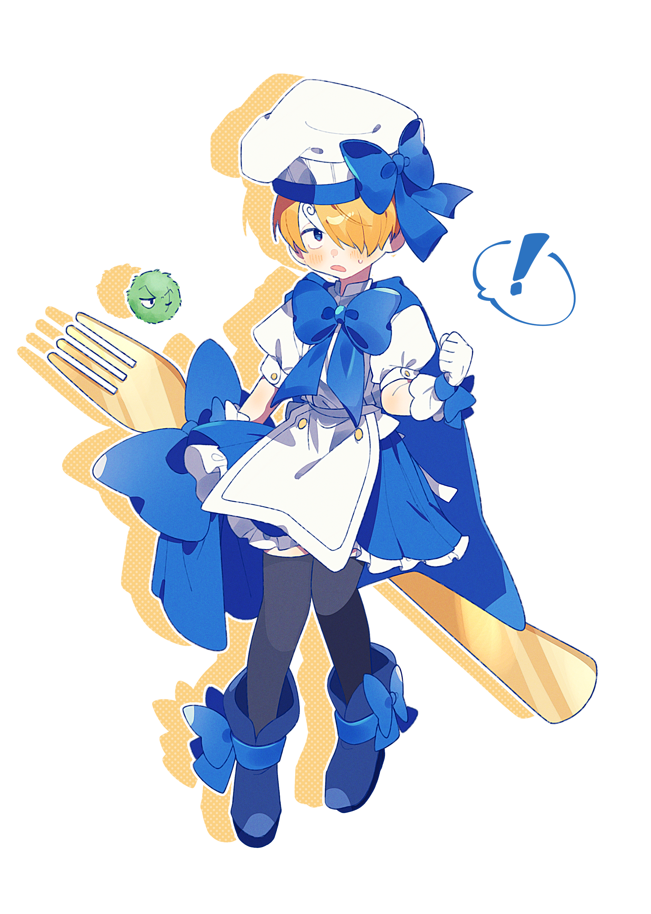 ! 1boy absurdres aged_down apron black_socks blonde_hair blue_bow blue_eyes blue_footwear blue_skirt blush boots bow chef_hat clenched_hand commentary_request crossdressing crossdressing_(mtf) curly_eyebrows fork gloves hair_over_one_eye hat hat_bow highres holding holding_fork kneehighs long_bangs male_focus marimo_zoro moss natori one_piece open_mouth puffy_short_sleeves puffy_sleeves sanji_(one_piece) scar scar_across_eye scar_on_face shadow short_hair short_sleeves simple_background skirt socks spoken_exclamation_mark sweat sweatdrop white_background white_gloves