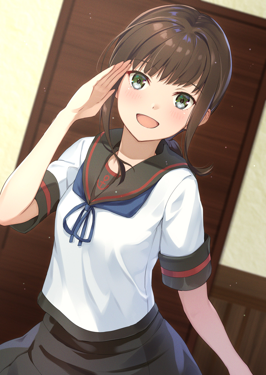 1girl :d black_sailor_collar black_skirt blue_neckerchief blush brown_hair commentary_request commission fubuki_(kancolle) fubuki_kai_ni_(kancolle) green_eyes hand_up highres indoors kanden_sky kantai_collection long_hair looking_at_viewer low_ponytail neckerchief open_mouth paid_reward_available pixiv_commission ponytail sailor_collar salute school_uniform serafuku shirt short_ponytail short_sleeves sidelocks skirt smile solo upper_body white_shirt