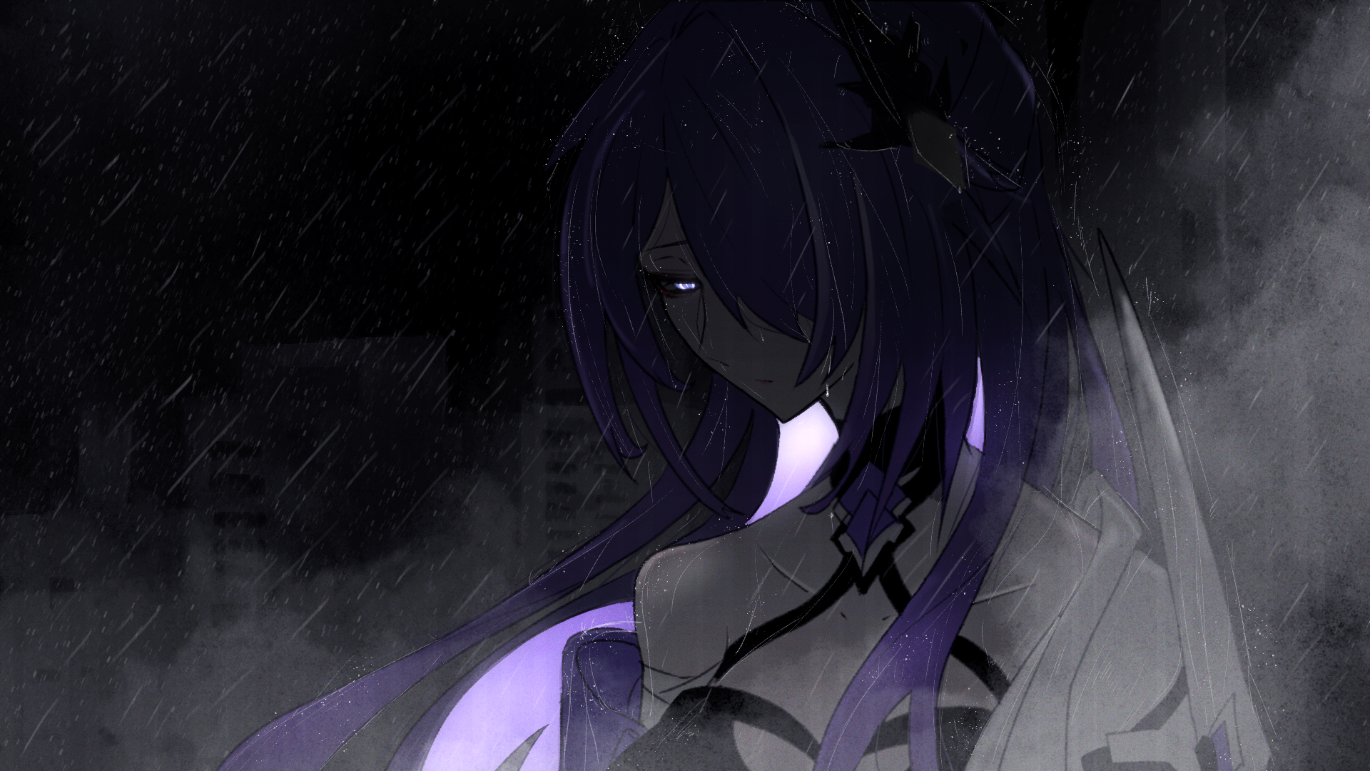 1girl acheron_(honkai:_star_rail) bare_shoulders black_sclera cityscape colored_sclera commentary fog glowing glowing_eye glowing_hair hair_ornament halterneck highres honkai:_star_rail honkai_(series) jacket long_hair looking_down messy_hair monochrome one_eye_covered purple_hair rain spot_color white_jacket yukiharuorent
