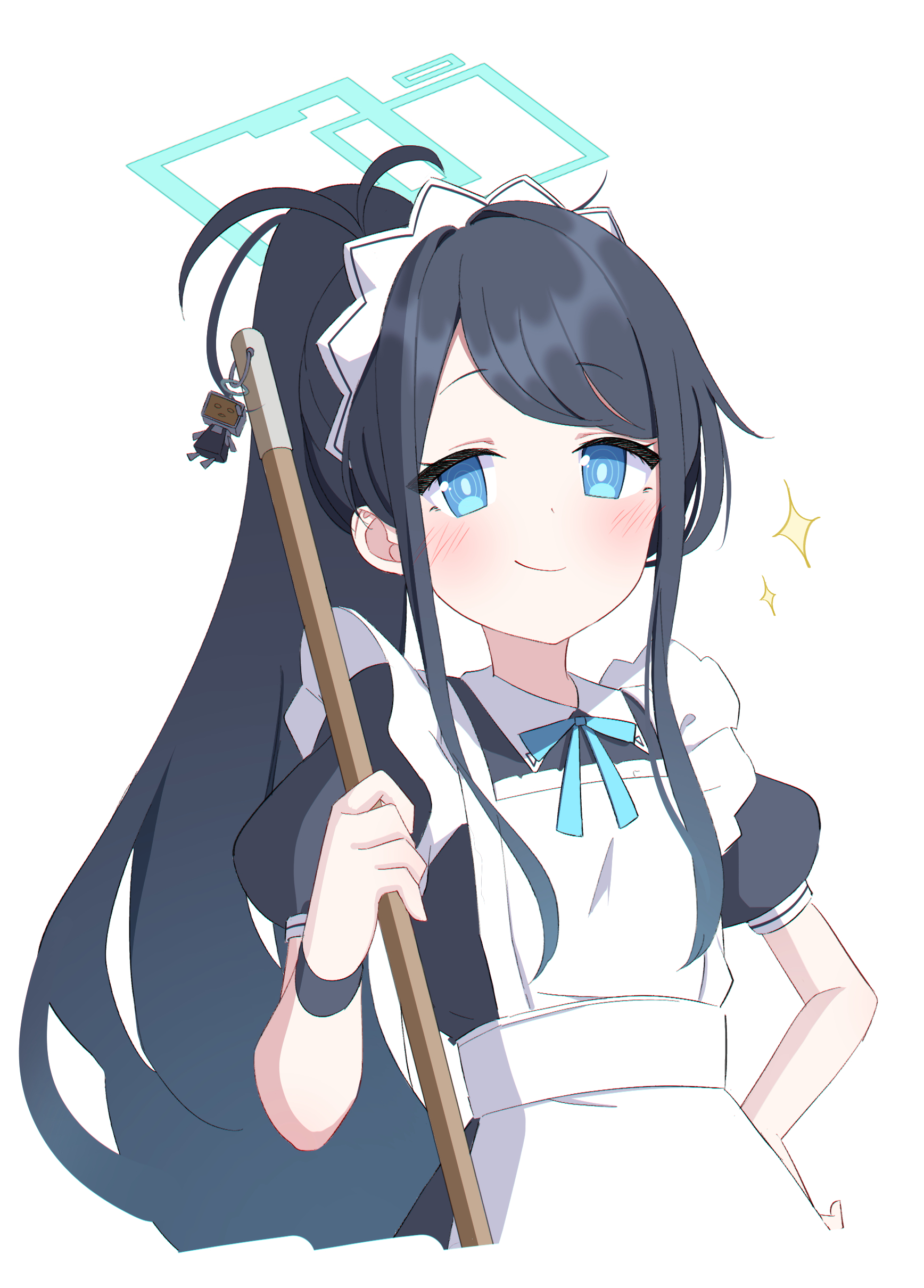 1girl absurdres apron aris_(blue_archive) aris_(maid)_(blue_archive) black_hair black_shirt blue_archive blue_eyes blue_ribbon blush broom closed_mouth commentary_request cropped_torso dot_nose foulo_paints halo hand_on_own_hip high_ponytail highres holding holding_broom kei_(robot)_(blue_archive) long_hair looking_at_viewer maid_headdress neck_ribbon ponytail puffy_short_sleeves puffy_sleeves ribbon shirt short_sleeves simple_background smile solo swept_bangs white_apron white_background