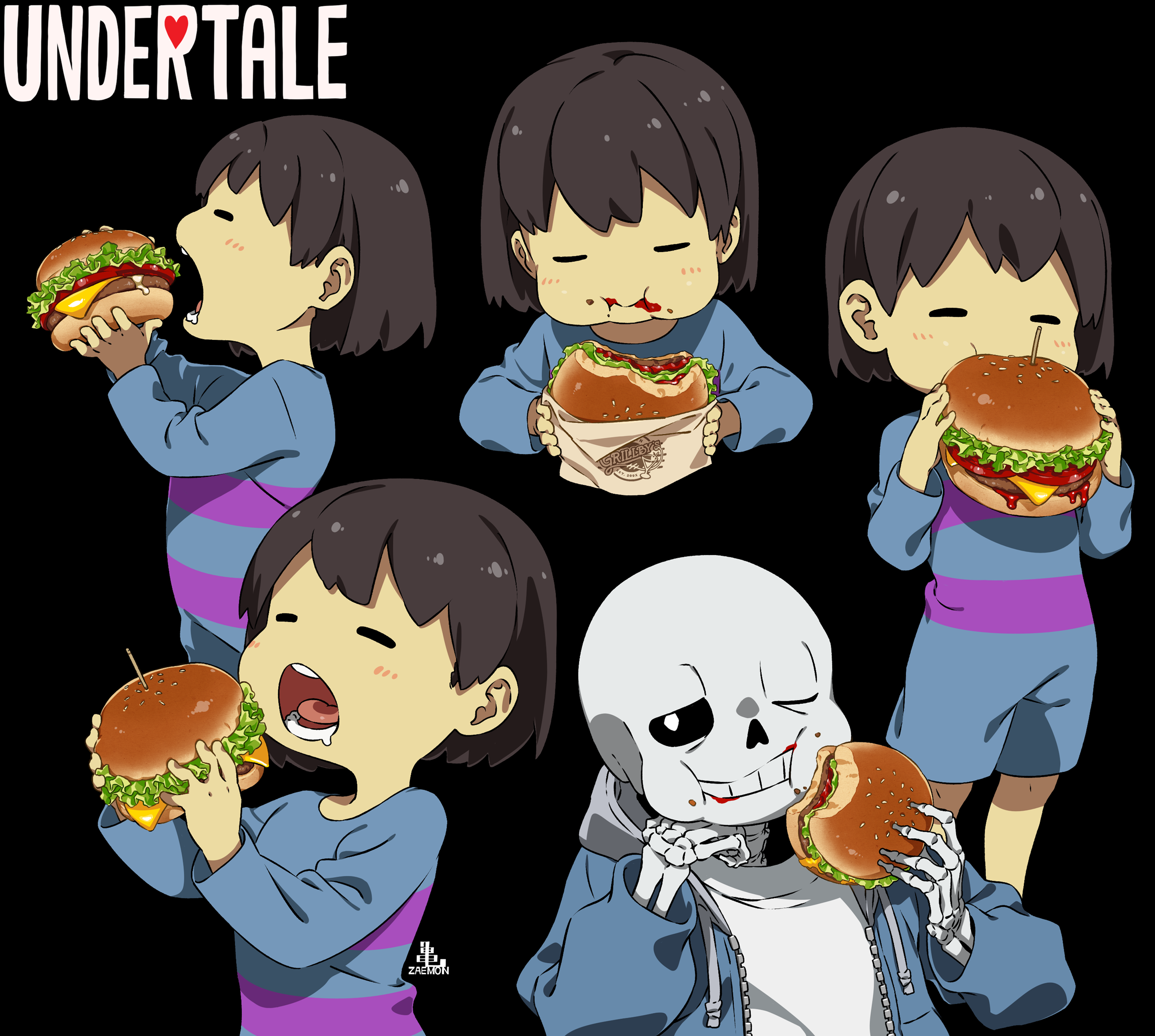 1boy 1other :i androgynous black_background blue_jacket brown_hair burger cel_shading chewing child copyright_name cropped_torso drawstring eating facing_viewer food food_on_face frisk_(undertale) from_side highres holding holding_burger holding_food hood hood_down hooded_jacket jacket kamezaemon ketchup long_sleeves multiple_views no_nose one_eye_closed open_clothes open_jacket open_mouth other_focus profile romper sans_(undertale) shirt short_hair simple_background skeleton standing undertale upper_body utdr_(toby_fox) white_shirt zipper