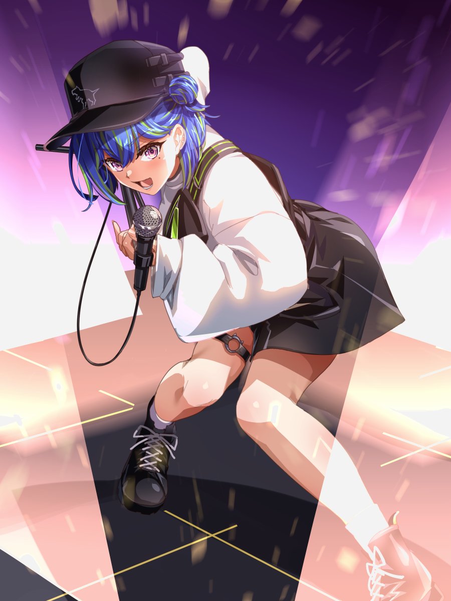 1girl baseball_cap black_boots black_hat black_shorts blue_hair blush boots commentary_request double_bun fanny_pack full_body green_hair hair_between_eyes hair_bun hat high-waist_shorts highres holding holding_microphone long_sleeves looking_at_viewer microphone mole mole_under_eye motion_blur multicolored_hair nanashi_inc. official_alternate_costume open_mouth pink_eyes purple_background short_hair shorts socks solo squatting stage suzumi_nemo suzumi_nemo_(2nd_costume) sweater tomo_tomotosix two-tone_hair virtual_youtuber white_socks white_sweater