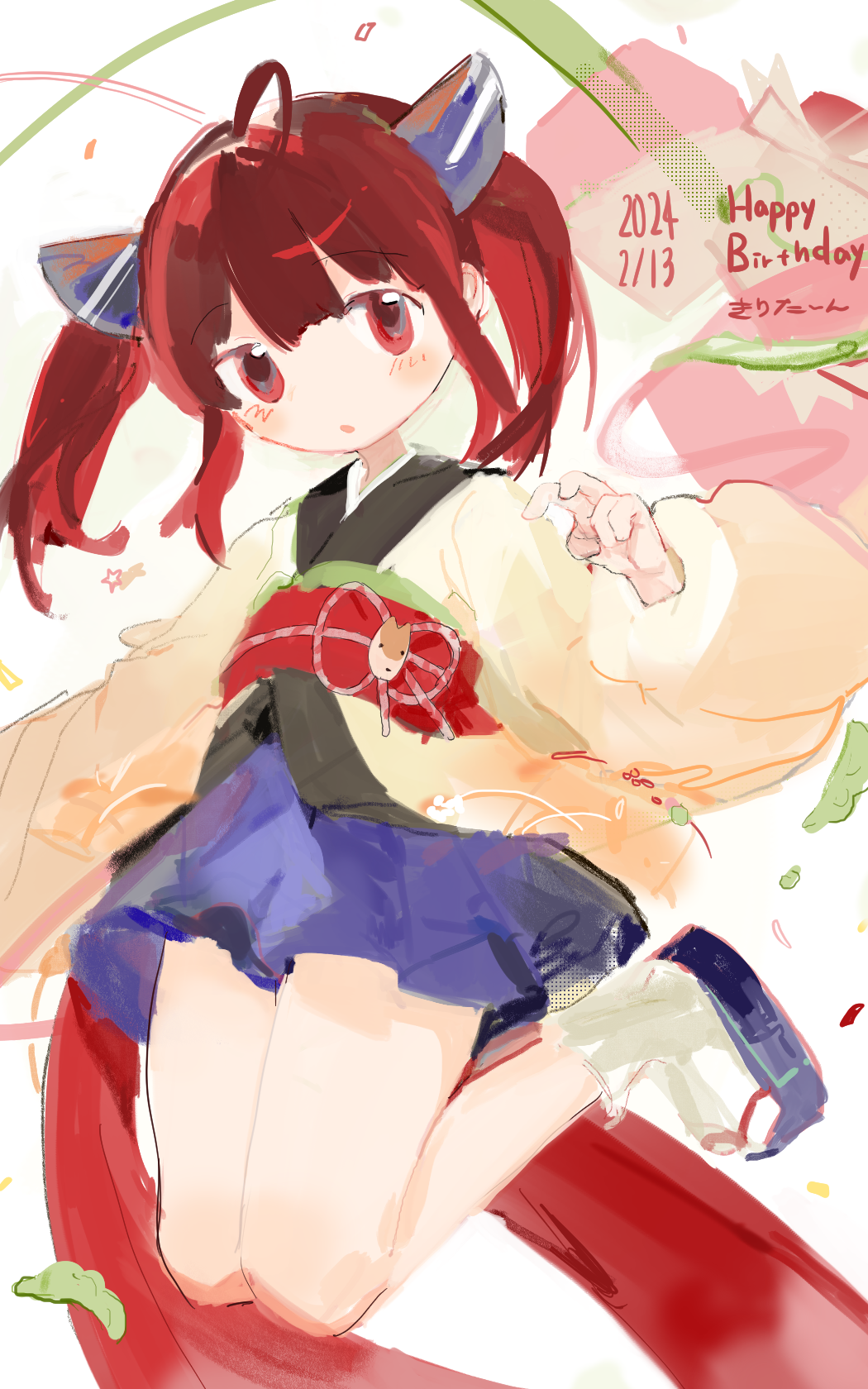 1girl blush character_name confetti dated geta happy_birthday headgear highres japanese_clothes kimono looking_at_viewer obi parted_lips pea_pod red_eyes red_hair sash short_kimono sidelocks simple_background solo streamers tabi tenpibo_ramune touhoku_kiritan twintails voiceroid wide_sleeves yellow_kimono