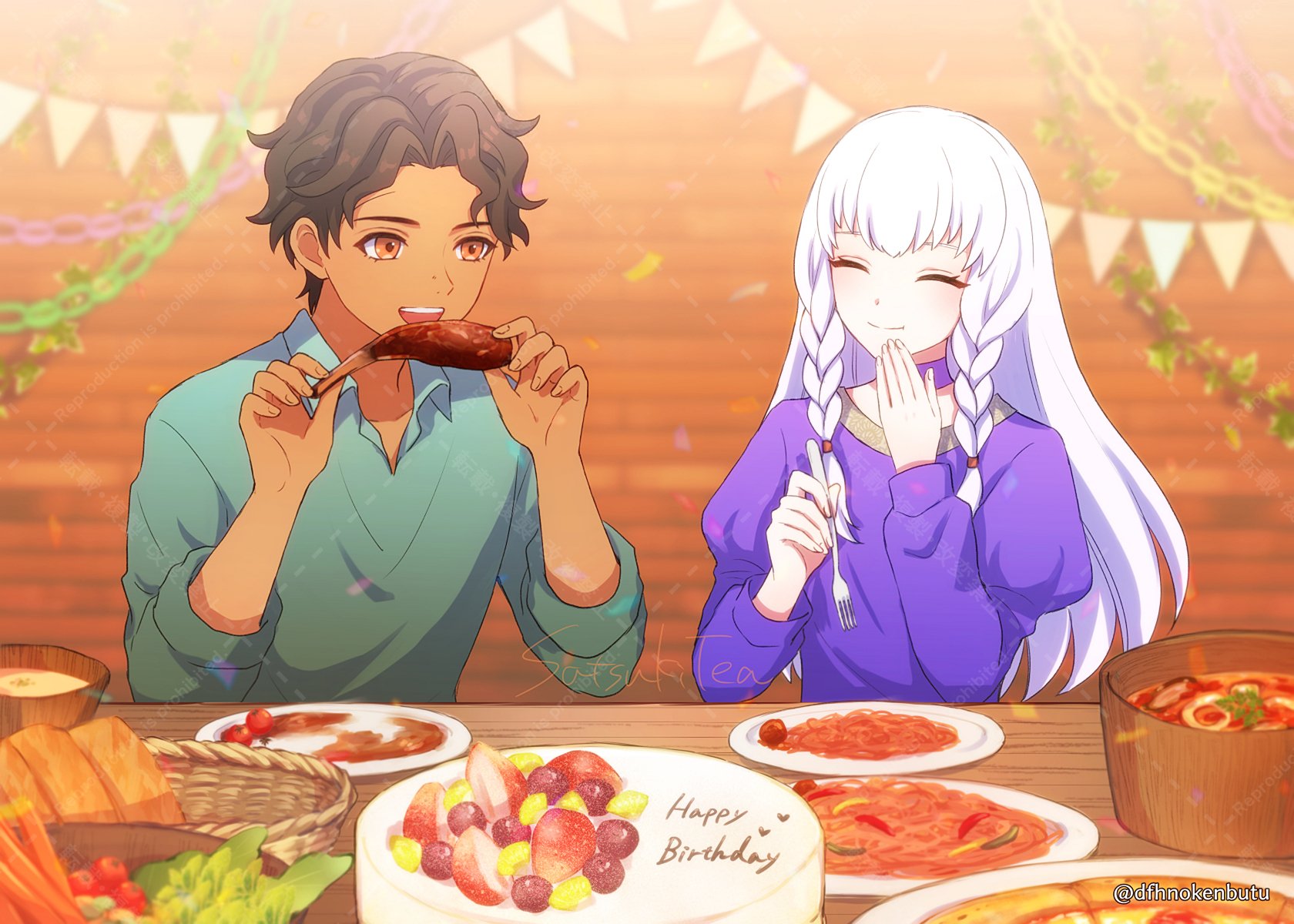 1boy 1girl birthday_cake cake couple cyril_(fire_emblem) dark-skinned_male dark_skin dfhnokenbutu fire_emblem fire_emblem:_three_houses food happy_birthday hetero highres lysithea_von_ordelia nintendo white_hair