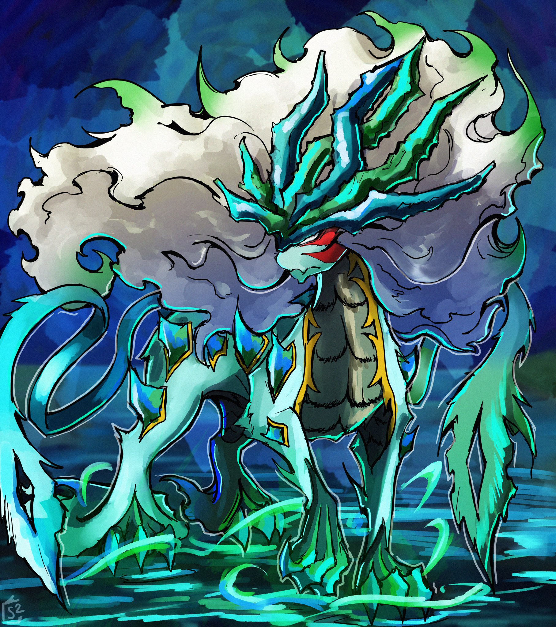 alternate_color alternate_eye_color aura claws corruption crossover dark_persona facial_tattoo fierce_deity gen_2_pokemon highres horns legendary_pokemon long_hair looking_to_the_side nintendo no_pupils pokemon pokemon_(creature) possessed possession standing standing_on_liquid stoic_seraphim suicune tattoo the_legend_of_zelda the_legend_of_zelda:_majora's_mask water white_eyes white_hair