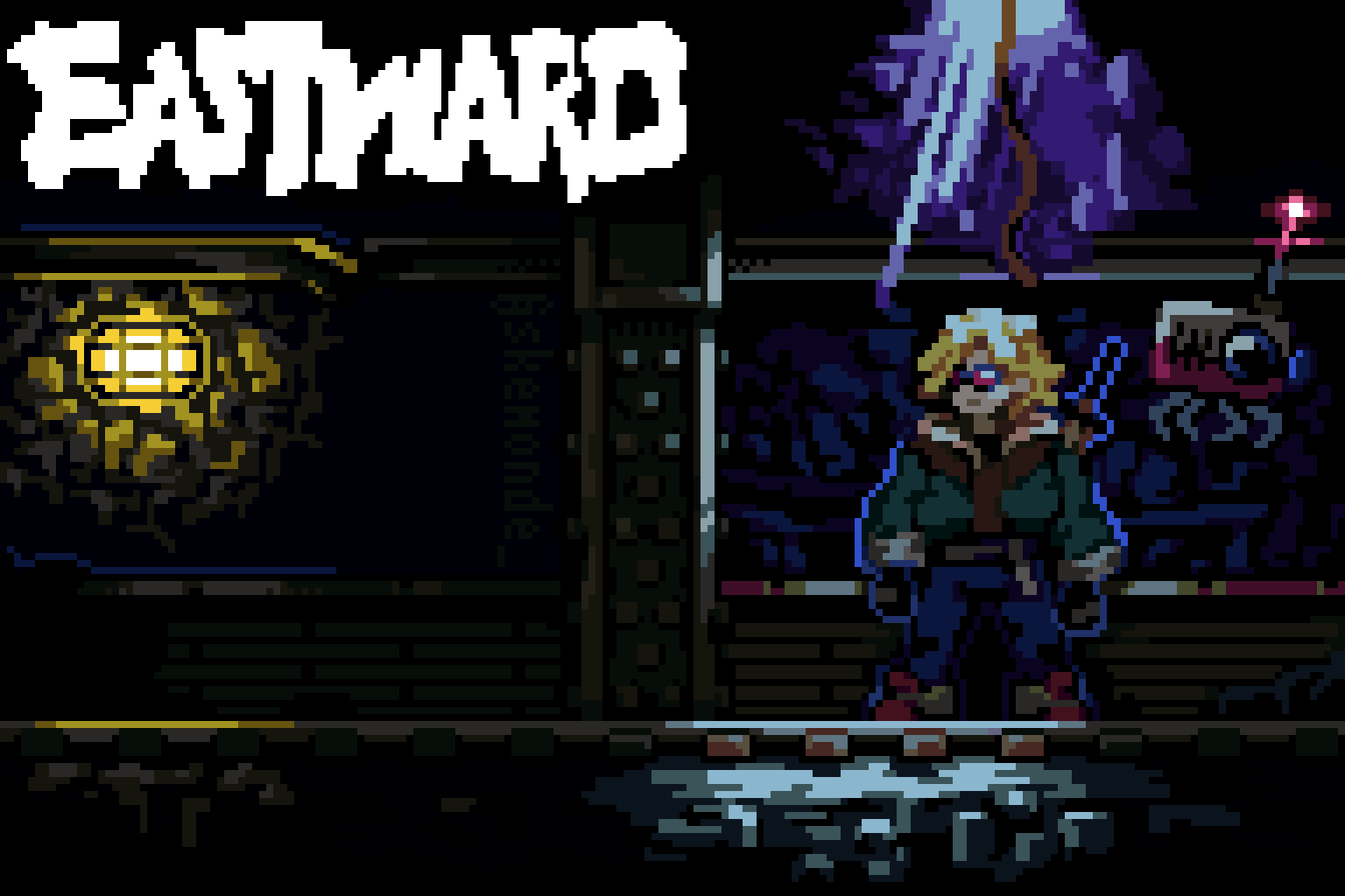 blonde_hair darkness eastward green_jacket isabel_(eastward) jacket non-humanoid_robot pixel_art railroad_tracks red_footwear red_goggles robot skemonde weapon weapon_on_back