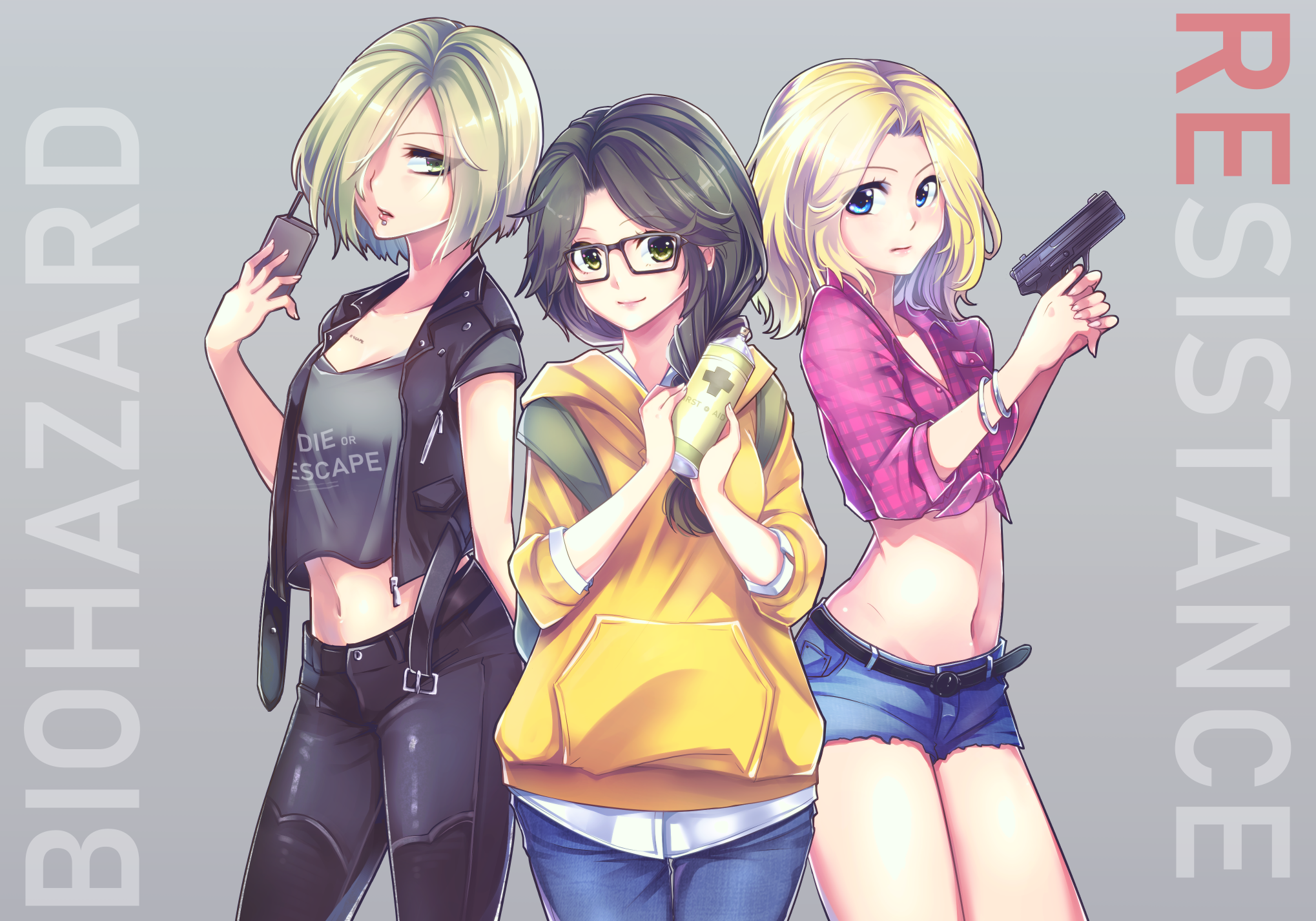 3girls backpack bag becca_woolett black_jacket black_pants blonde_hair blue_eyes blue_pants bracelet copyright_name glasses green_eyes grey_background gun hair_over_one_eye handgun highres holding holding_gun holding_walkie-talkie holding_weapon hood hoodie jacket january_van_sant jewelry multiple_girls nana_(kanaonet7) navel pants piercing resident_evil resident_evil:_resistance short_shorts shorts simple_background smile spray_can valerie_harmon walkie-talkie weapon yellow_hoodie