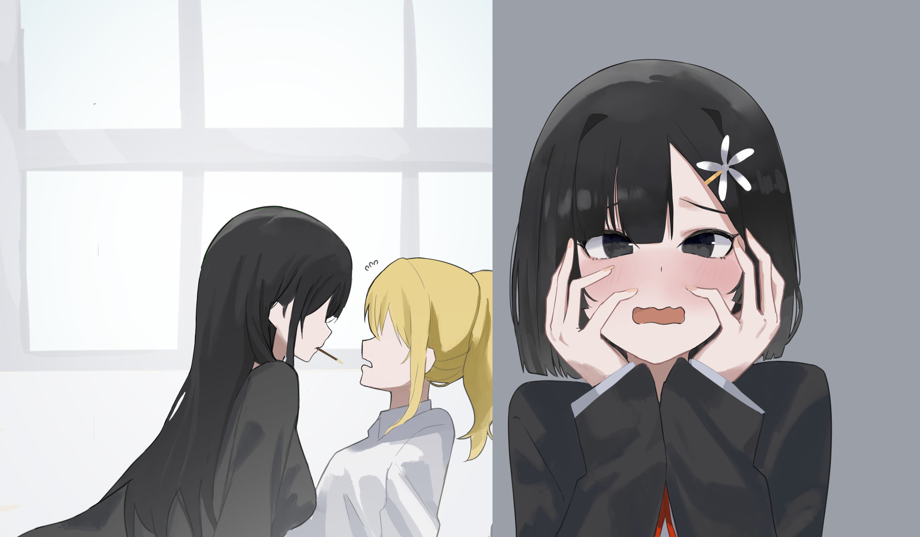 2girls black_eyes black_hair black_jacket blonde_hair blush commentary english_commentary flower flying_sweatdrops food food_in_mouth hair_flower hair_ornament hand_on_own_face highres indoors jacket long_hair medium_hair multiple_girls neck_ribbon open_mouth original pocky pocky_kiss ponytail red_ribbon ribbon school_uniform shared_food shirt ulette upper_body white_flower white_shirt window yuri