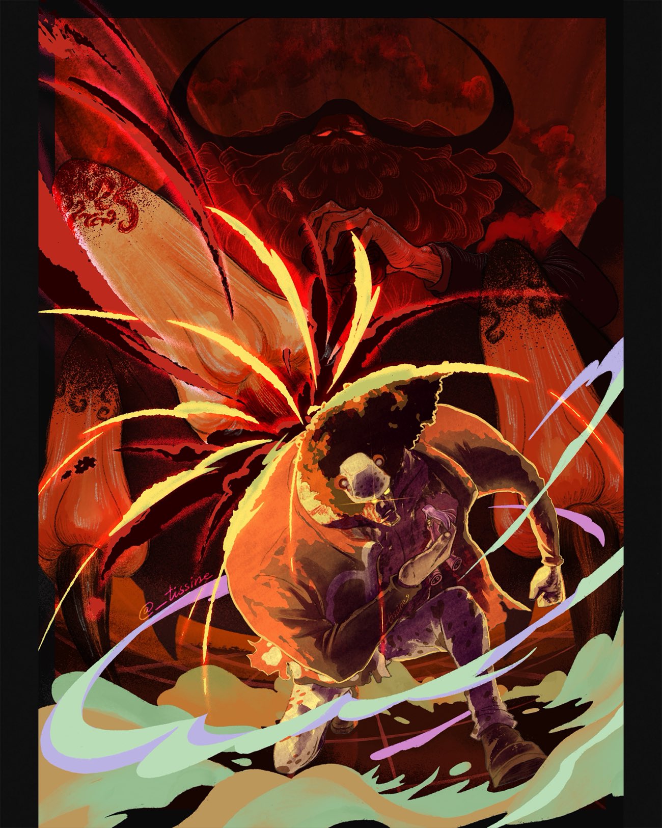 1girl 2boys animal_ears arthropod_boy bartholomew_kuma bear_ears beard black_hair black_shirt carrying carrying_person claws commentary curly_hair english_commentary facial_hair father_and_child father_and_daughter glowing glowing_eyes highres holding holding_staff horns jaygarcia_saturn jewelry_bonney long_beard long_hair multiple_boys on_one_knee one_piece parent_and_child pink_hair red_eyes red_theme shirt size_difference spider_boy staff thick_beard tissine twitter_username white_hair white_headwear yellow_eyes
