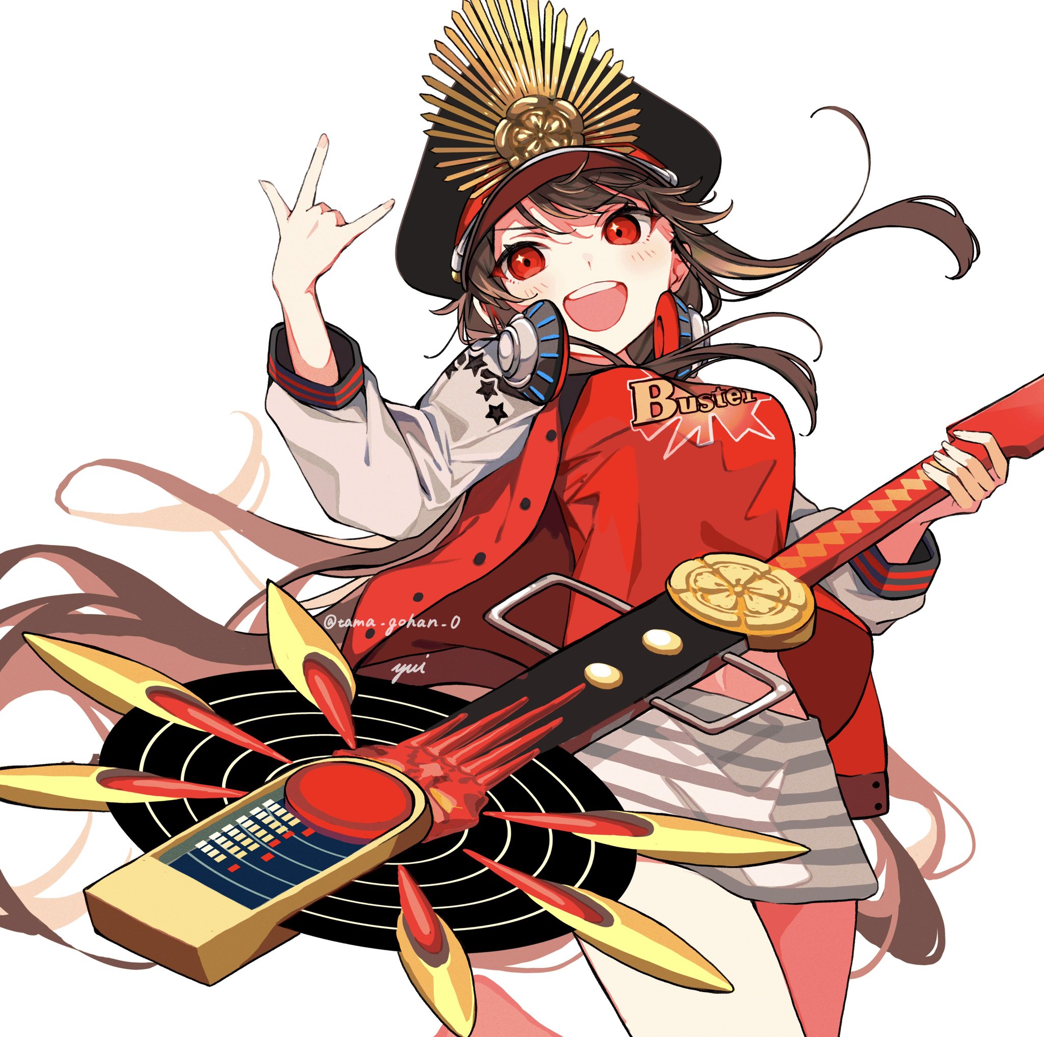 1girl artist_name black_hair buster_shirt crest family_crest fate/grand_order fate_(series) guitar hat headphones headphones_around_neck highres holding holding_instrument instrument jacket koha-ace leg_up letterman_jacket long_hair m/ military_hat oda_nobunaga_(fate) oda_nobunaga_(swimsuit_berserker)_(fate) oda_nobunaga_(swimsuit_berserker)_(first_ascension)_(fate) oda_uri peaked_cap red_eyes simple_background skirt solo sparkling_eyes striped_clothes striped_skirt twitter_username white_background yui_(tamagohan)