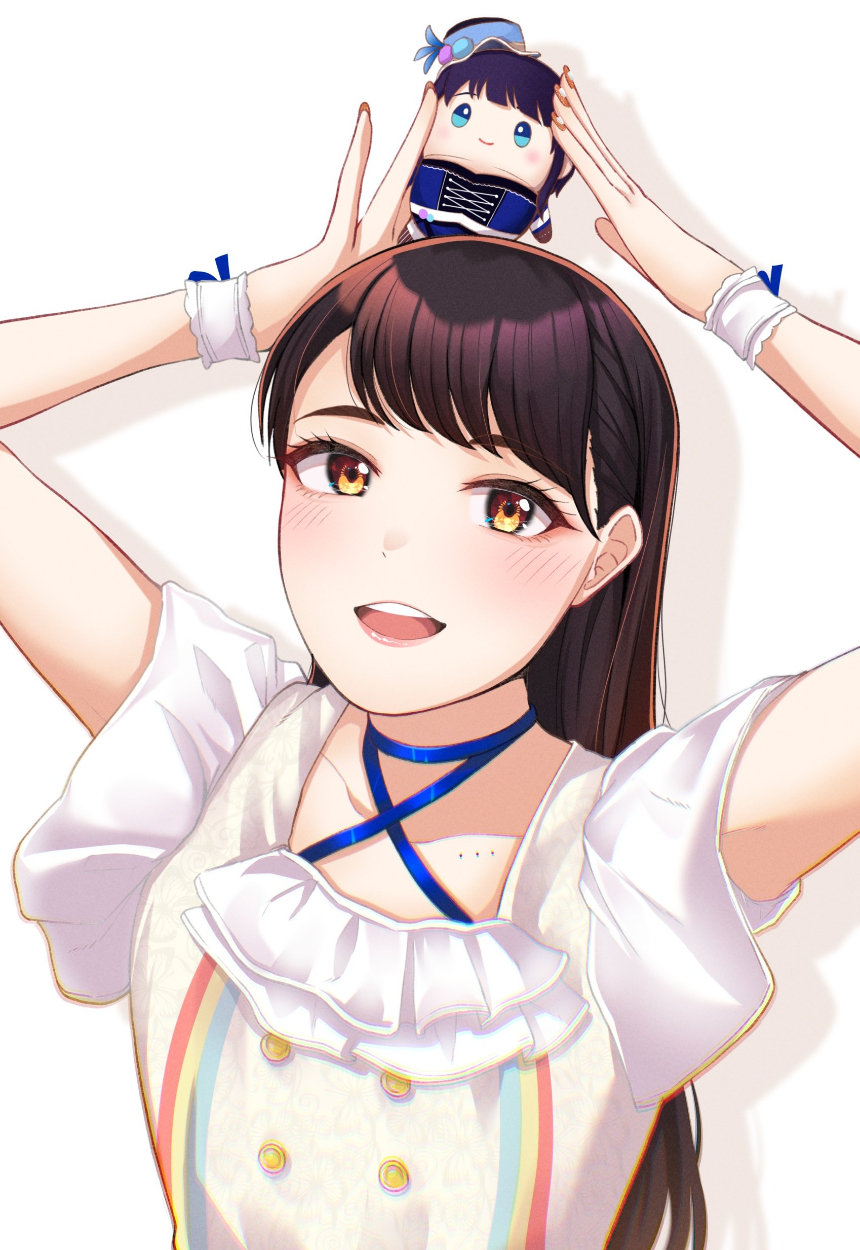 1girl absurdres asaka_karin black_hair blush character_doll collarbone commentary_request doll highres holding holding_doll kubota_miyu long_hair looking_at_viewer love_live! love_live!_nijigasaki_high_school_idol_club open_mouth real_life rrtp shadow shirt short_sleeves solo standing starlight_(love_live!) swept_bangs upper_body voice_actor voice_actor_connection white_background white_shirt wrist_cuffs yellow_eyes