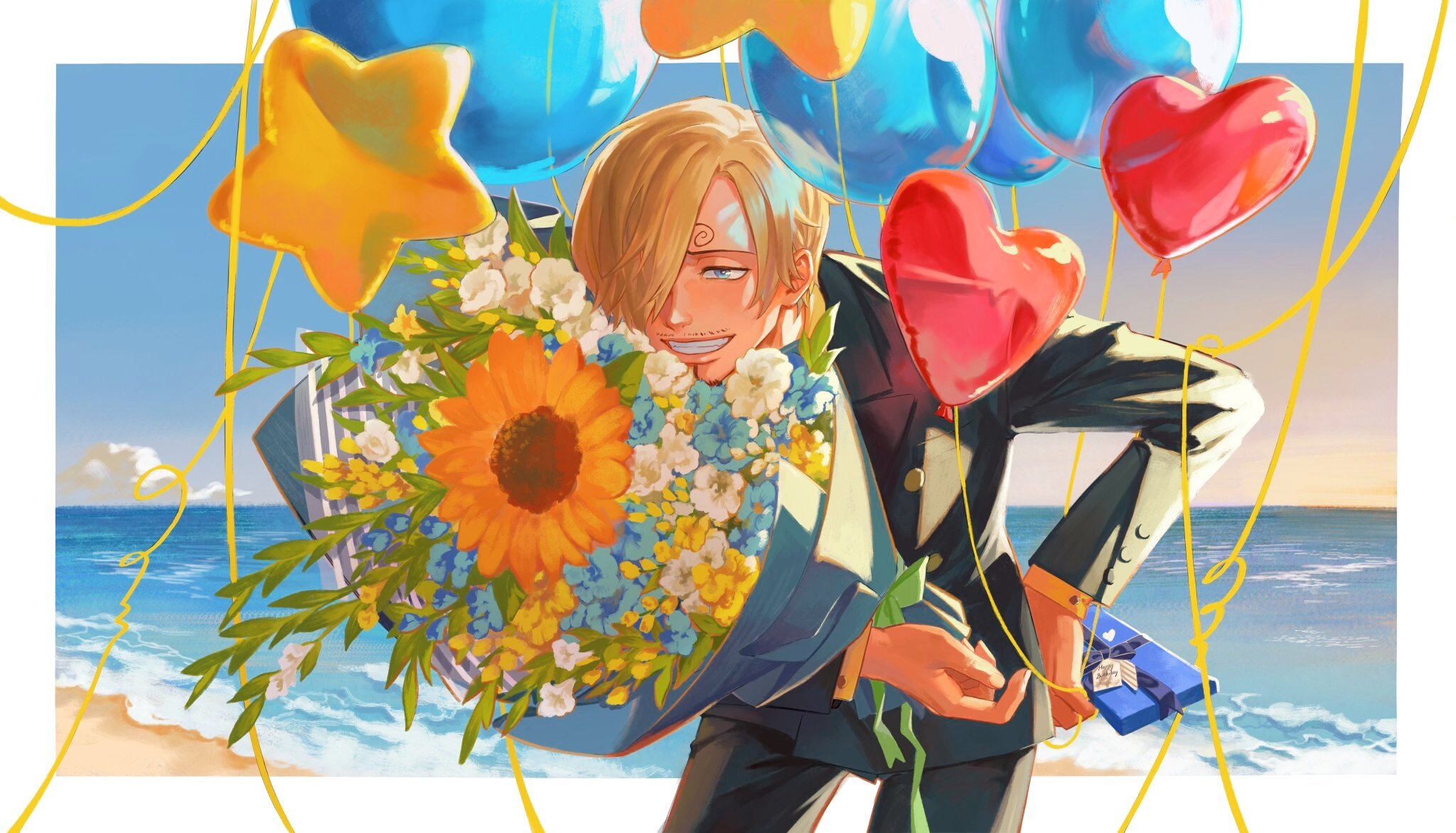 1boy arm_behind_back balloon bent_over black_suit blonde_hair blue_eyes blue_flower bouquet candy chocolate chocolate_bar curly_eyebrows facial_hair flower food formal_clothes goatee green_ribbon heart_balloon highres holding holding_balloon holding_bouquet jennyandloiryan mustache ocean one_piece outdoors ribbon sanji_(one_piece) short_hair smile suit sunset white_flower yellow_flower