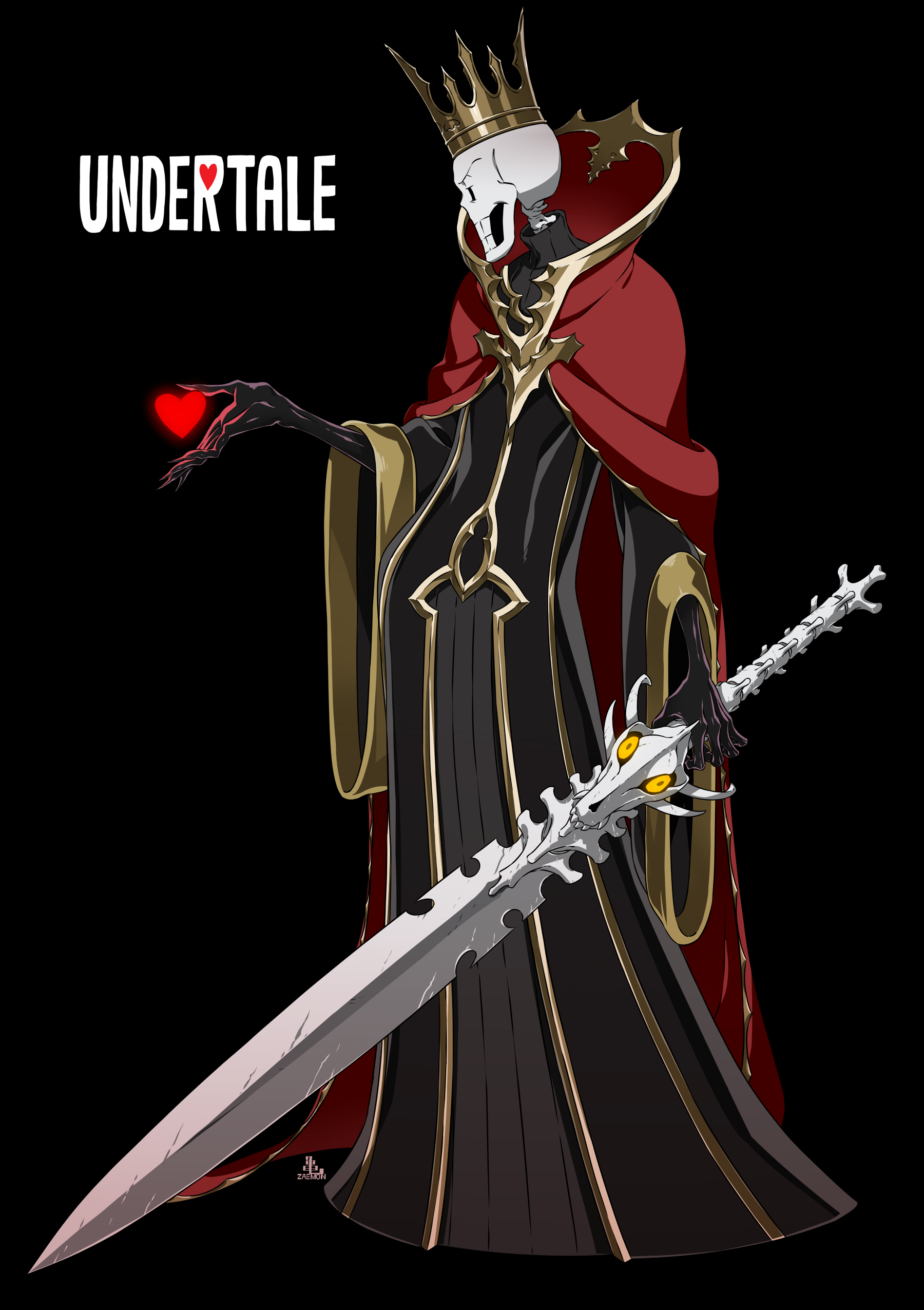1boy absurdres alternate_costume black_background black_robe black_skin bone bone_weapon cel_shading cloak collared_cloak colored_skin commentary_request copyright_name crown from_side full_body glowing grin heart high_collar highres holding holding_sword holding_weapon kamezaemon male_focus papyrus_(undertale) profile red_cloak robe scratches simple_background skeleton smile solid_oval_eyes solo standing sword turtleneck undertale utdr_(toby_fox) weapon wide_sleeves