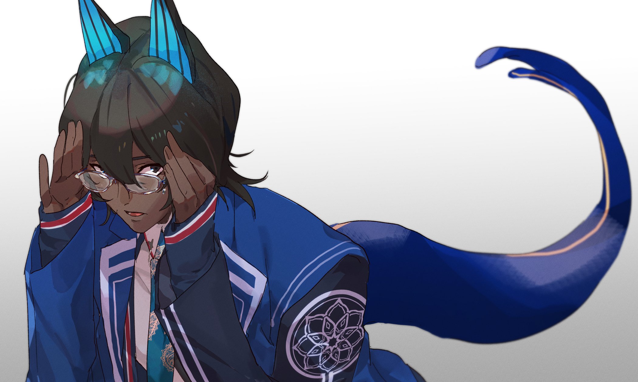 1boy arjuna_(fate) arjuna_alter_(fate) arjuna_alter_(student_council_president)_(fate) black_eyes black_hair blue_shirt dark-skinned_male dark_skin embroidery fate/grand_order fate_(series) glasses hair_between_eyes hands_on_own_face highres horns koroponsu3 long_sleeves looking_at_viewer lotus_print necktie parted_lips shirt simple_background tail