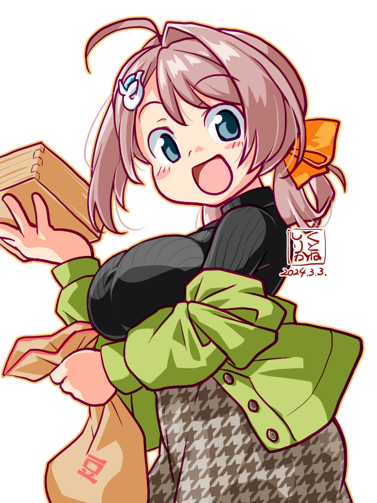 1girl ahoge artist_logo braid braided_hair_rings breasts brown_hair chougei_(kancolle) chougei_(setsubun)_(kancolle) dated dress green_jacket hair_ornament hair_ribbon hair_rings hairband jacket kantai_collection kutone_shirika large_breasts logo looking_at_viewer masu orange_hairband orange_outline outline ribbon simple_background smile sweater whale_hair_ornament