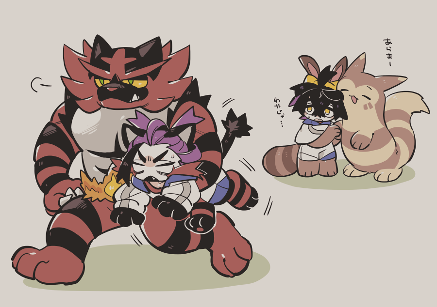 2boys ahoge angry animal animal_ears animal_hands belt black_fur black_hair blue_jacket blue_shirt blue_shorts body_fur brown_fur capelet carrying carrying_person cat_boy cat_ears cat_tail claws closed_eyes colored_sclera commentary_request crossed_bangs dual_persona facial_mark fang fangs fewer_digits fingernails fire frown full_body furret furrowed_brow gen_2_pokemon gen_7_pokemon green_pupils grey_fur grey_jacket hair_between_eyes hair_tie hair_tied hair_up hairband incineroar jacket kemonomimi_mode kieran_(pokemon) litten looking_ahead loose_hair_strand lunchbox_(artist) male_focus multicolored_fur multicolored_hair multicolored_jacket multicolored_shorts multiple_boys necktie nintendo no_pupils open_mouth paw_print pawpads pokemon pokemon_(creature) pokemon_scarlet_and_violet ponytail purple_hair red_fur red_necktie sentret sharp_fingernails shirt short_cape short_hair shorts sigh simple_background smile standing sweatdrop tail tank_top two-tone_hair walking whisker_markings white_background white_jacket white_shorts yellow_eyes yellow_hairband yellow_sclera
