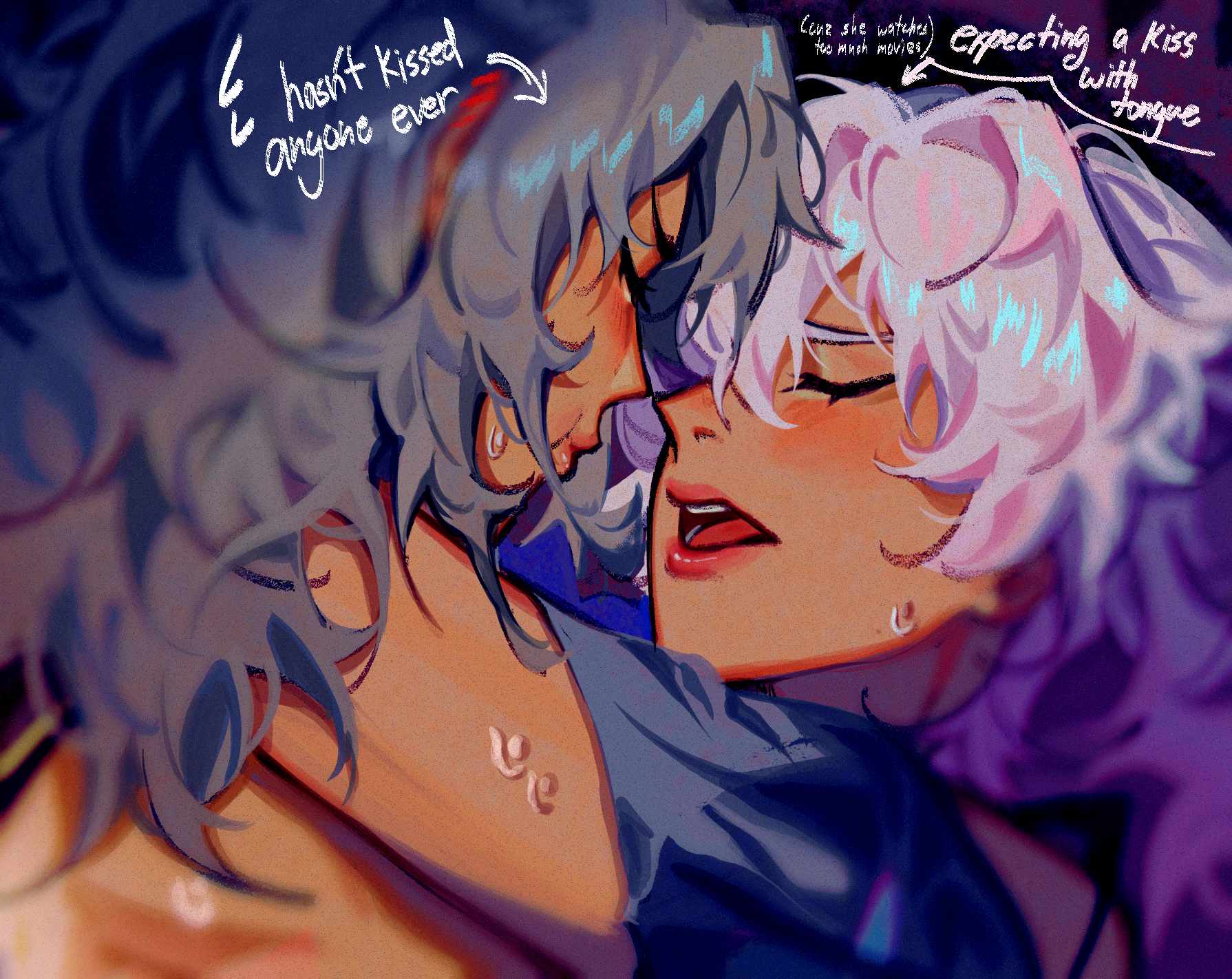 2girls arms_around_neck closed_eyes commentary english_commentary english_text grey_hair hasn't_kissed_anyone_ever_vs_expecting_a_kiss_with_tongue_(meme) highres honkai:_star_rail honkai_(series) hug imminent_kiss imnotxreitive long_hair march_7th_(honkai:_star_rail) meme multiple_girls open_mouth pink_hair stelle_(honkai:_star_rail) sweat trailblazer_(honkai:_star_rail) upper_body yuri