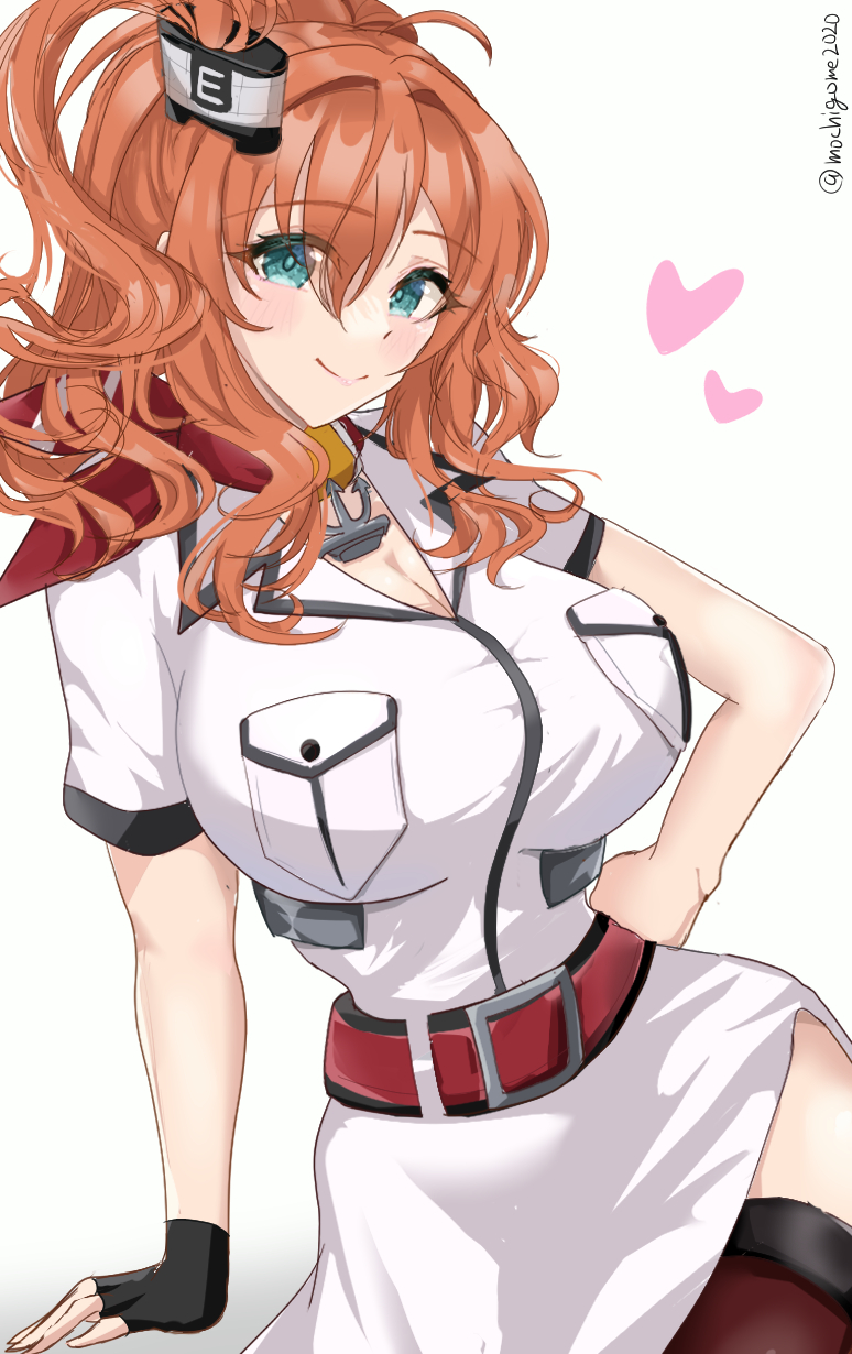 1girl anchor belt black_trim blush breast_pocket breasts brown_hair chamumi_(mochiumee) cowboy_shot dress fingerless_gloves gloves green_eyes hair_between_eyes hair_ornament heart high_side_ponytail highres kantai_collection large_breasts light_blush long_hair looking_at_viewer neckerchief pocket ponytail red_belt red_neckerchief red_thighhighs saratoga_(kancolle) side_ponytail sidelocks single_glove smile solo thighhighs white_background white_dress