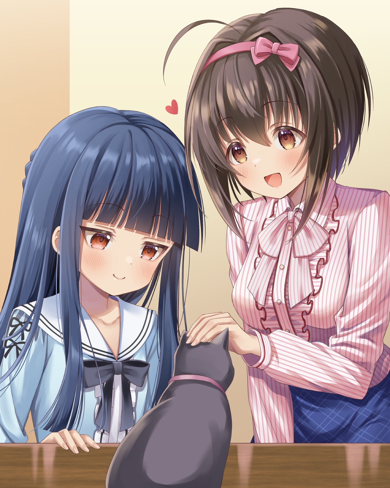 2girls ahoge black_cat blue_bow blue_bowtie blue_hair blue_ribbon blue_shirt blue_skirt blunt_bangs blush bow bowtie braid breasts brown_eyes brown_hair cat center_frills closed_mouth collarbone commentary frilled_shirt frills hair_bow hair_intakes hairband half_up_braid heart hibiki_tohru highres idolmaster idolmaster_cinderella_girls indoors jitome kohinata_miho long_hair long_sleeves medium_breasts multiple_girls open_mouth pero_(idolmaster_cinderella_girls) petting pink_bow pink_bowtie pink_hairband pink_shirt plaid_clothes plaid_skirt red_eyes ribbon sailor_collar sajo_yukimi shirt short_hair_with_long_locks sidelocks skirt smile striped_bow striped_bowtie striped_clothes striped_shirt table vertical-striped_clothes vertical-striped_shirt white_sailor_collar