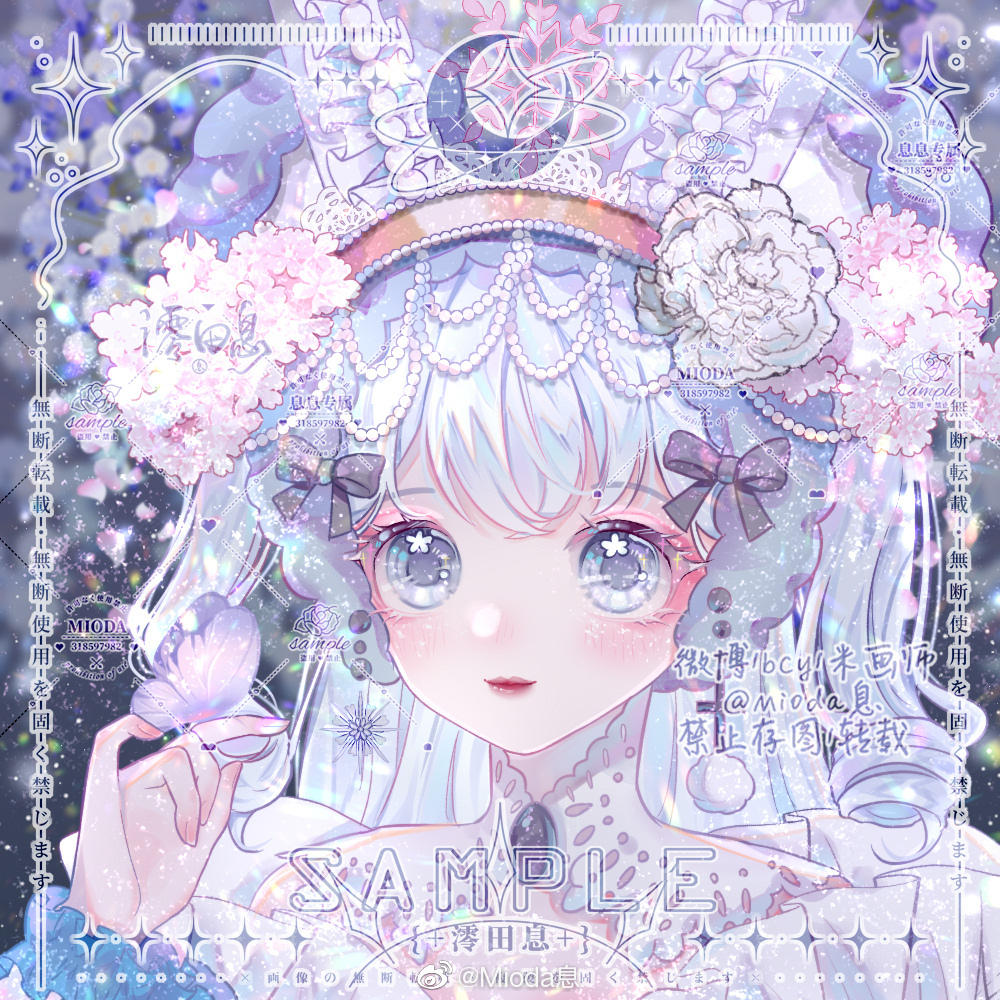 1girl beads black_background black_bow black_gem bow bug butterfly butterfly_on_hand cherry_blossoms chinese_commentary collared_shirt commentary_request commission crescent cross cross_earrings double_bun earrings eyelashes eyeshadow fingernails floral_background flower flower_in_eye frilled_sleeves frills gem gold_hairband grey_eyes hair_beads hair_bow hair_bun hair_flower hair_ornament hairband hand_up high_collar insect jewelry light_blush lips long_sleeves looking_at_viewer makeup mioda_xi mismatched_earrings original parted_lips pink_eyeshadow pink_flower pink_nails pom_pom_(clothes) pom_pom_earrings purple_butterfly red_lips rose sample_watermark shirt smile solo sparkle symbol_in_eye too_many_watermarks two_side_up upper_body watermark white_flower white_headwear white_rose white_shirt