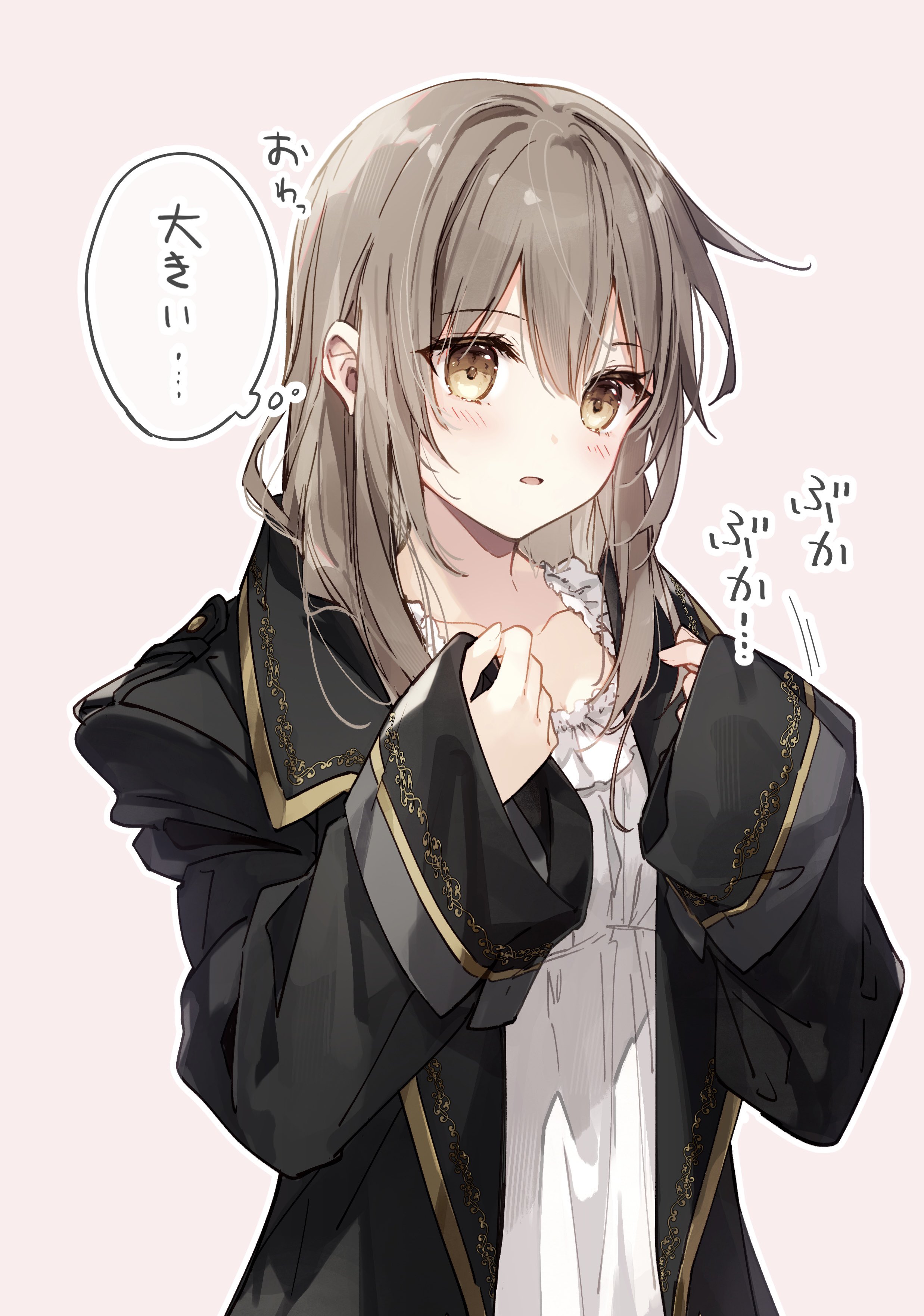 1girl absurdres annelise_(mochizuki_shiina) black_jacket blush borrowed_clothes brown_background brown_eyes brown_hair commentary_request dress frilled_dress frills hair_between_eyes highres jacket karisome_no_shitsuji_to_koushaku_no_himegoto long_hair long_sleeves mochizuki_shiina open_clothes open_jacket oversized_clothes simple_background sleeves_past_wrists solo translation_request upper_body white_dress