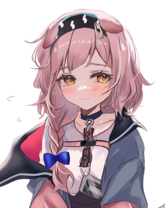 1girl animal_ears arknights black_choker black_hairband blue_bow blush bow braid brown_eyes cat_ears cat_girl cat_tail choker collarbone commentary_request flying_sweatdrops goldenglow_(arknights) grey_jacket hair_bow hair_over_shoulder hairband jacket lightning_bolt_print long_hair off_shoulder one-hour_drawing_challenge open_clothes open_jacket print_hairband raramente shirt simple_background single_braid solo tail upper_body white_background white_shirt