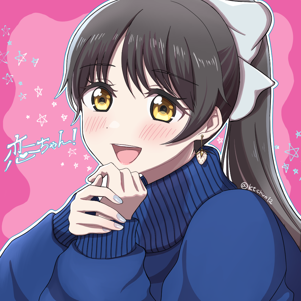 1girl black_hair blue_sweater blush brown_eyes commentary_request earrings hazuki_ren jewelry long_sleeves looking_at_viewer love_live! love_live!_superstar!! morupuru open_mouth outline pink_background ponytail sidelocks solo sweater translation_request twitter_username upper_body white_outline