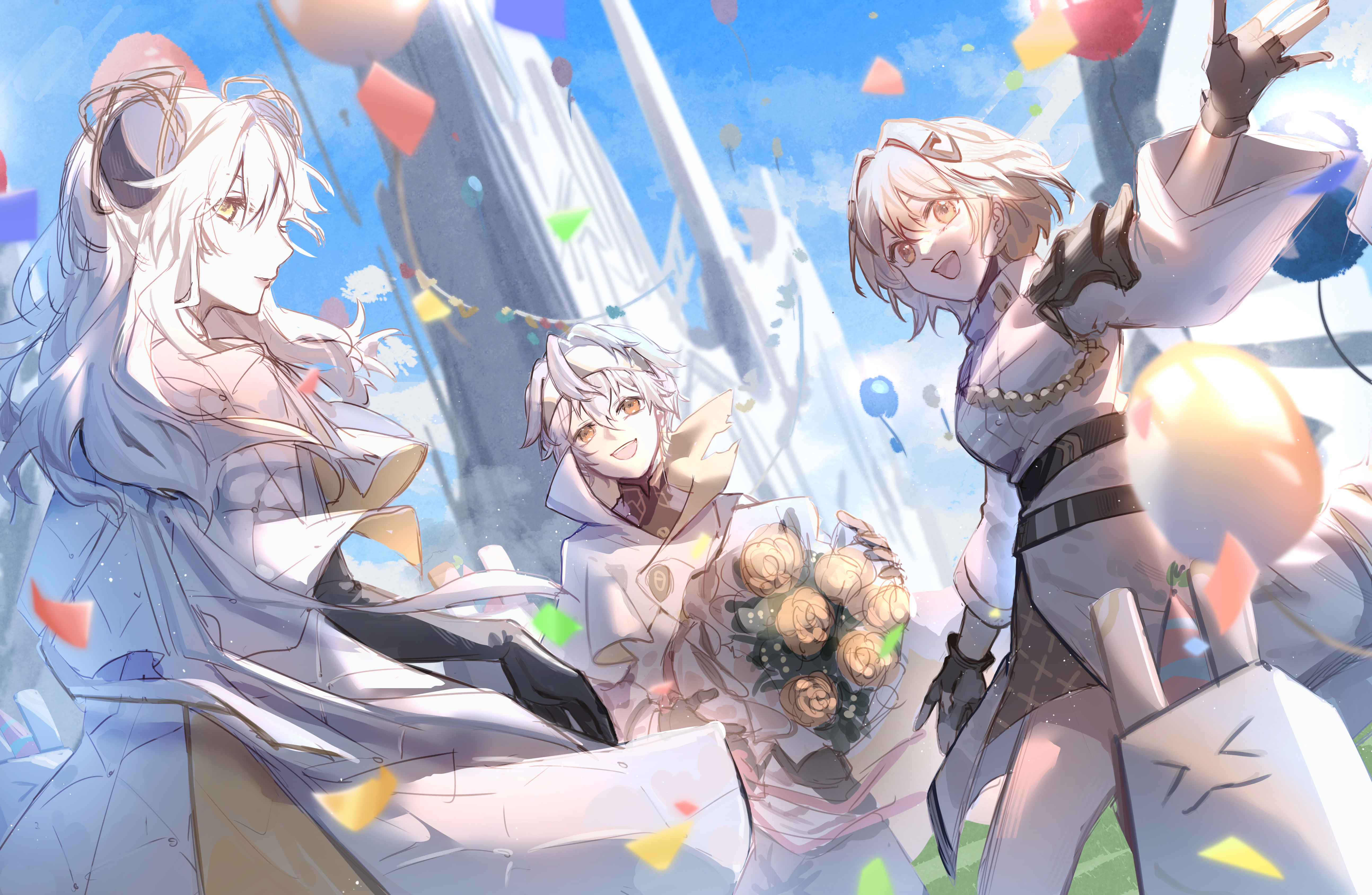 1boy 2girls absurdres alchemy_stars allenerie balloon black_gloves blonde_hair bouquet brown_eyes brown_hair carleen_(alchemy_stars) chubb_(alchemy_stars) confetti dress elbow_gloves feet_out_of_frame flower from_behind gloves hair_ornament hairband high_collar highres holding holding_bouquet jacket lipstick looking_ahead looking_at_viewer looking_back makeup marble_(stone) military_uniform multiple_girls navigator_(alchemy_stars) partially_fingerless_gloves single_shoulder_pad smile teeth upper_teeth_only vice_(alchemy_stars) white_dress white_hair white_jacket yellow_eyes