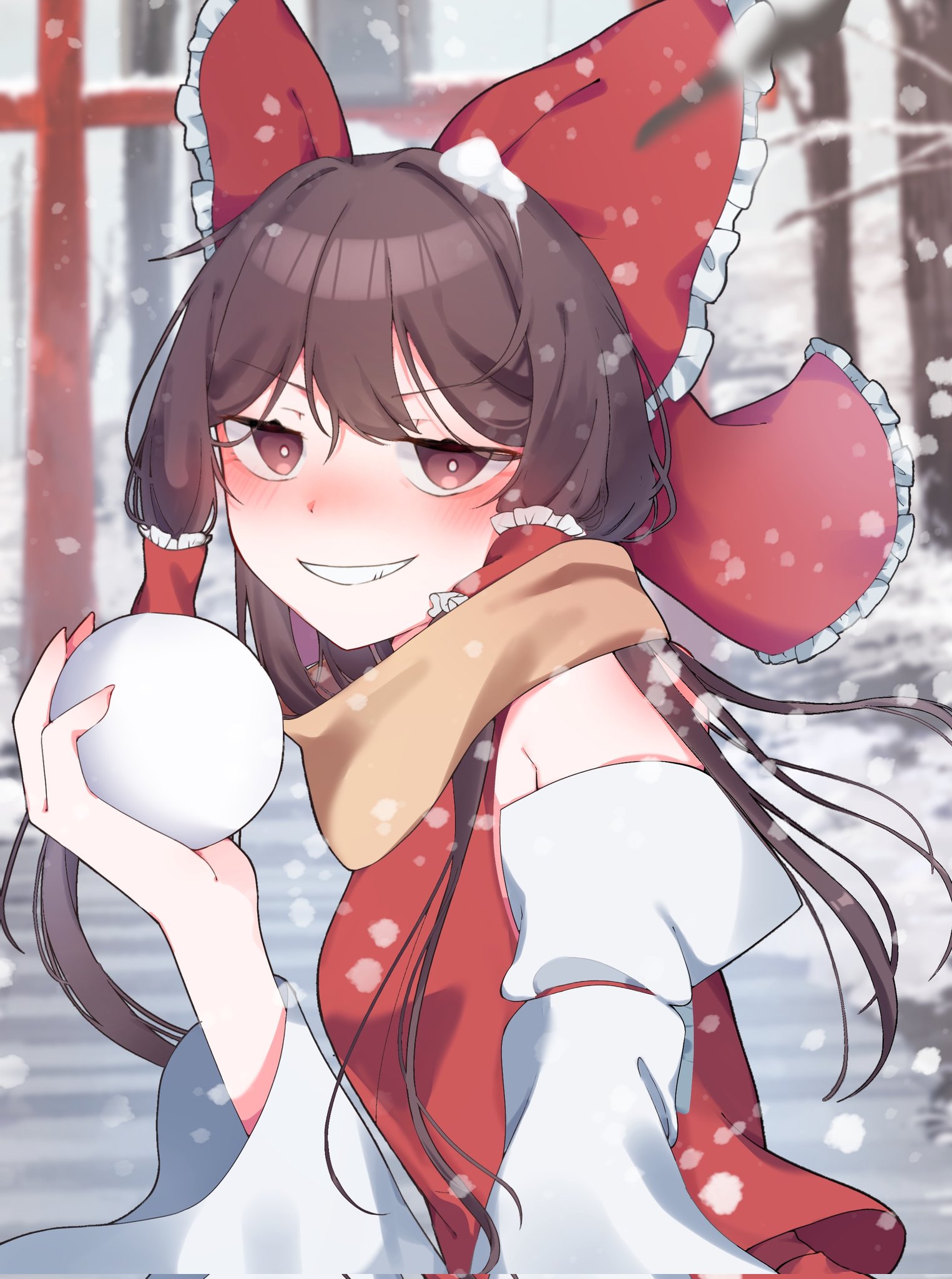 1girl blush bow brown_eyes brown_hair commentary_request corrupted_twitter_file detached_sleeves frilled_bow frilled_hair_tubes frills hair_bow hair_tubes hakurei_reimu hand_up highres holding holding_snowball looking_at_viewer medium_hair outdoors red_bow red_ribbon red_shirt ribbon ribbon-trimmed_sleeves ribbon_trim rwft3bpgzzqk634 scarf shirt shoulder_blush smile snow snow_on_head snowball snowing solo teeth torii touhou tree upper_body yellow_scarf