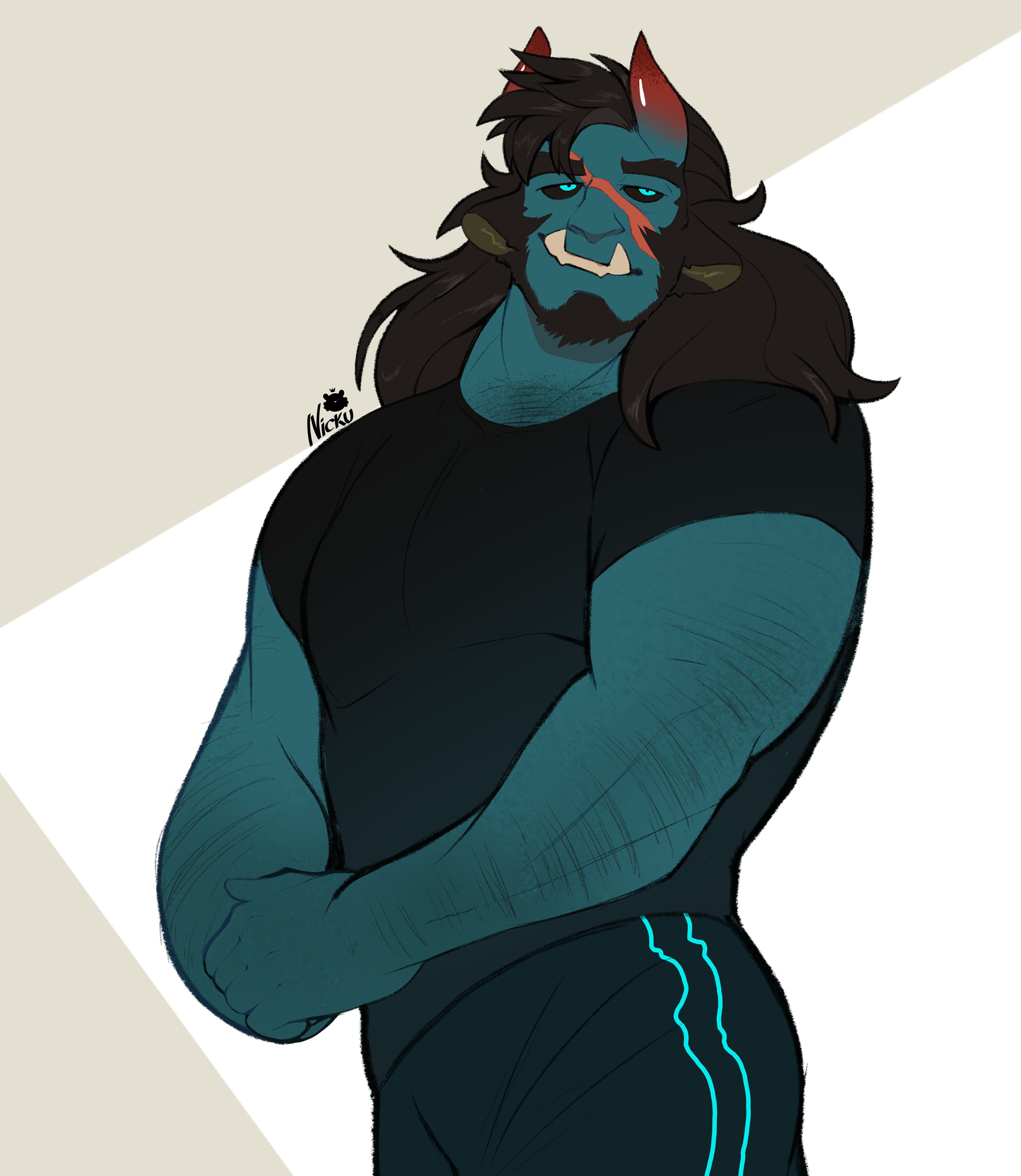 1boy absurdres animal_ears bara beard black_hair black_sclera chest_hair_peek colored_sclera colored_skin cow_ears demon_boy demon_horns facial_hair full_beard gradient_horns green_skin hairy highres horns long_hair looking_at_viewer male_focus mature_male monster_boy multicolored_horns muscular muscular_male nicku_arts orc original own_hands_together pants pectorals red_horns scar scar_on_face scar_on_nose shirt shy skin-covered_horns smile solo t-shirt thick_arm_hair thick_beard thick_eyebrows track_pants tusks vitri_(retrosharkspike)