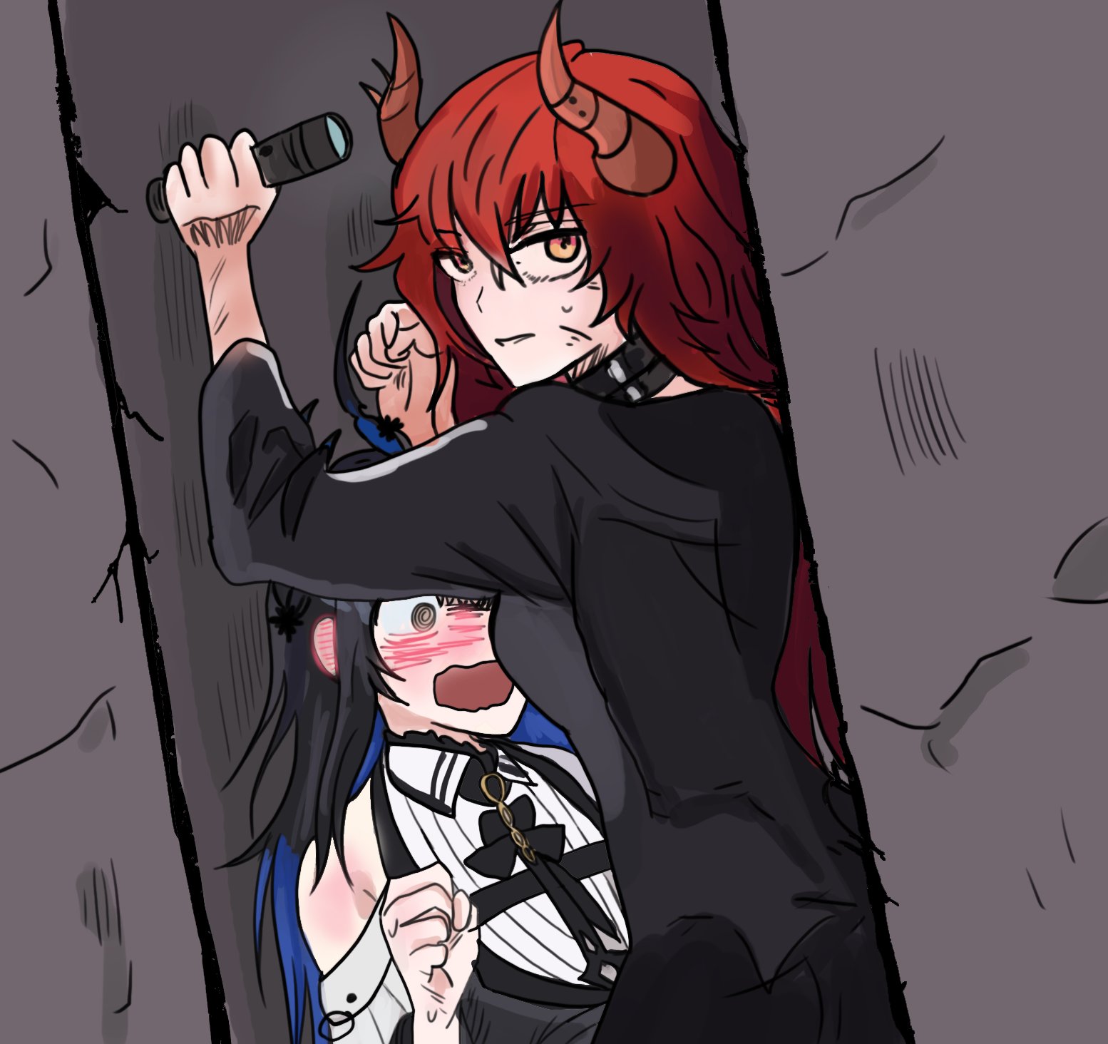 2girls asymmetrical_horns black_choker black_hair blue_hair blush choker collared_shirt colored_inner_hair demon_horns dragon_girl dragon_horns highres hololive hololive_english horns kabedon looking_at_viewer multicolored_hair multiple_girls napat nerissa_ravencroft nerissa_ravencroft_(1st_costume) open_mouth red_hair shirt virtual_youtuber vshojo white_shirt yellow_eyes zentreya zentreya_(dragon)