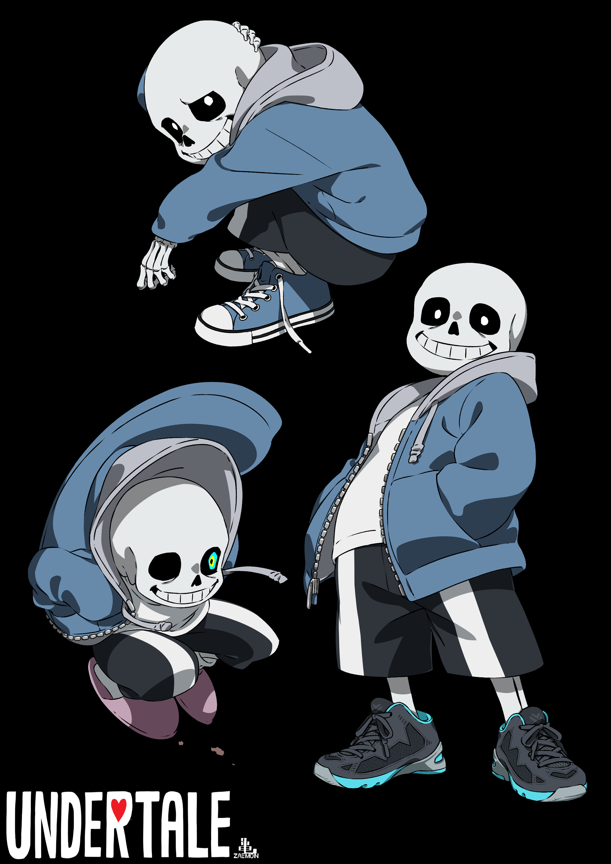 1boy absurdres black_background black_footwear black_sclera black_shorts blue_eyes blue_jacket cel_shading colored_sclera copyright_name drawstring grin hand_on_own_head hands_in_pockets highres hood hood_down hooded_jacket jacket kamezaemon looking_at_viewer male_focus multiple_views open_clothes open_jacket pink_slippers sans_(undertale) shirt shoes shorts simple_background skeleton slippers smile sneakers squatting standing undertale utdr_(toby_fox) white_eyes white_shirt zipper