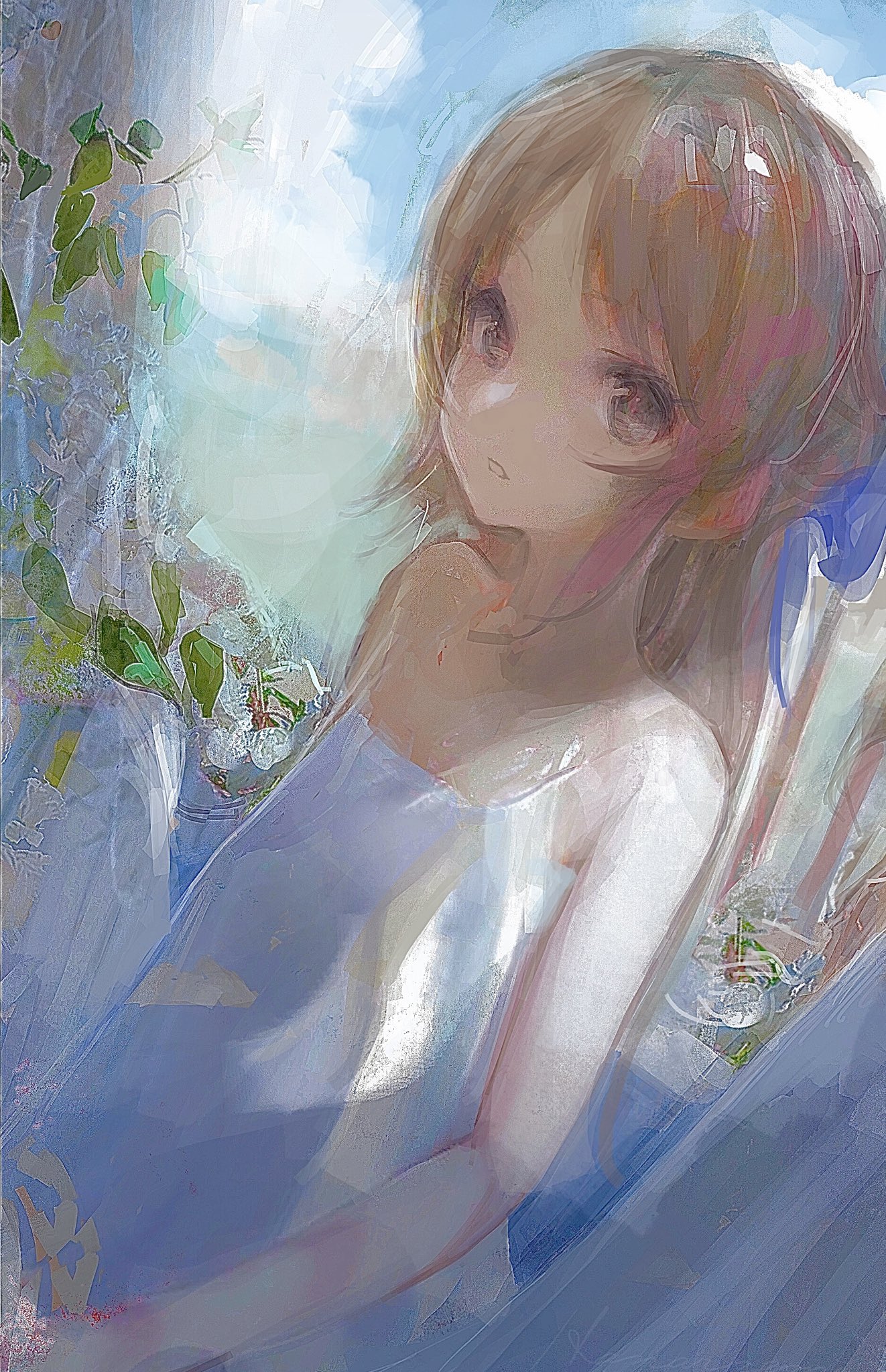 1girl bare_shoulders blue_bow blue_sky bow brown_eyes brown_hair cloud day dress expressionless flat_chest hair_bow highres idolmaster idolmaster_cinderella_girls long_hair looking_at_viewer parted_lips sketch sky solo tachibana_arisu white_dress xxxhanaremexxx