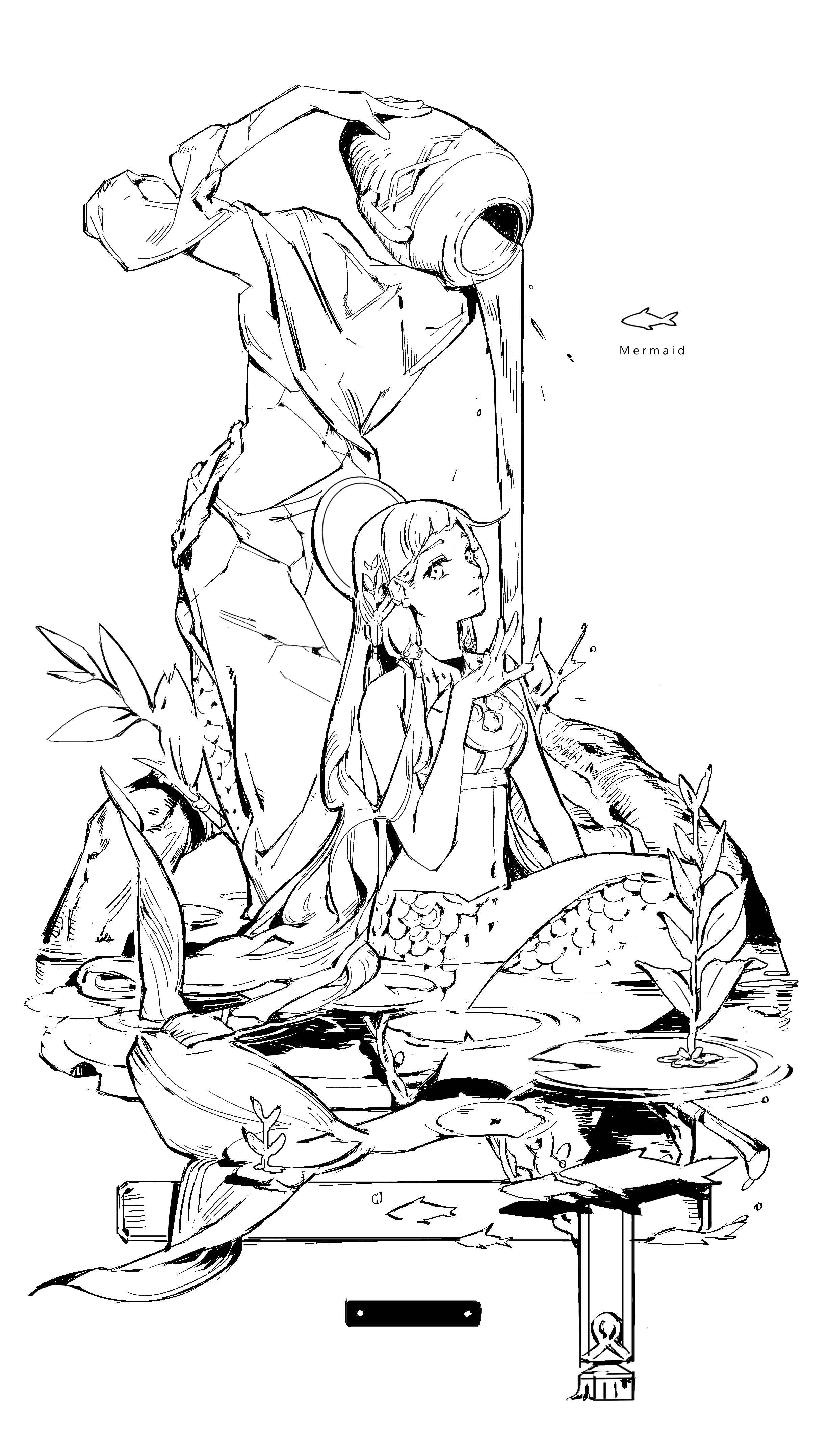 absurdres aquarius_(constellation) bare_arms bare_shoulders blunt_bangs closed_mouth commentary english_commentary english_text expressionless eyelashes fish highres holding_pitcher hong_(hong11117) lily_pad lineart long_hair looking_at_viewer mermaid monster_girl original outstretched_hand partially_submerged pitcher_(container) pouring rock simple_background sitting statue stomach strapless tube_top very_long_hair water white_background