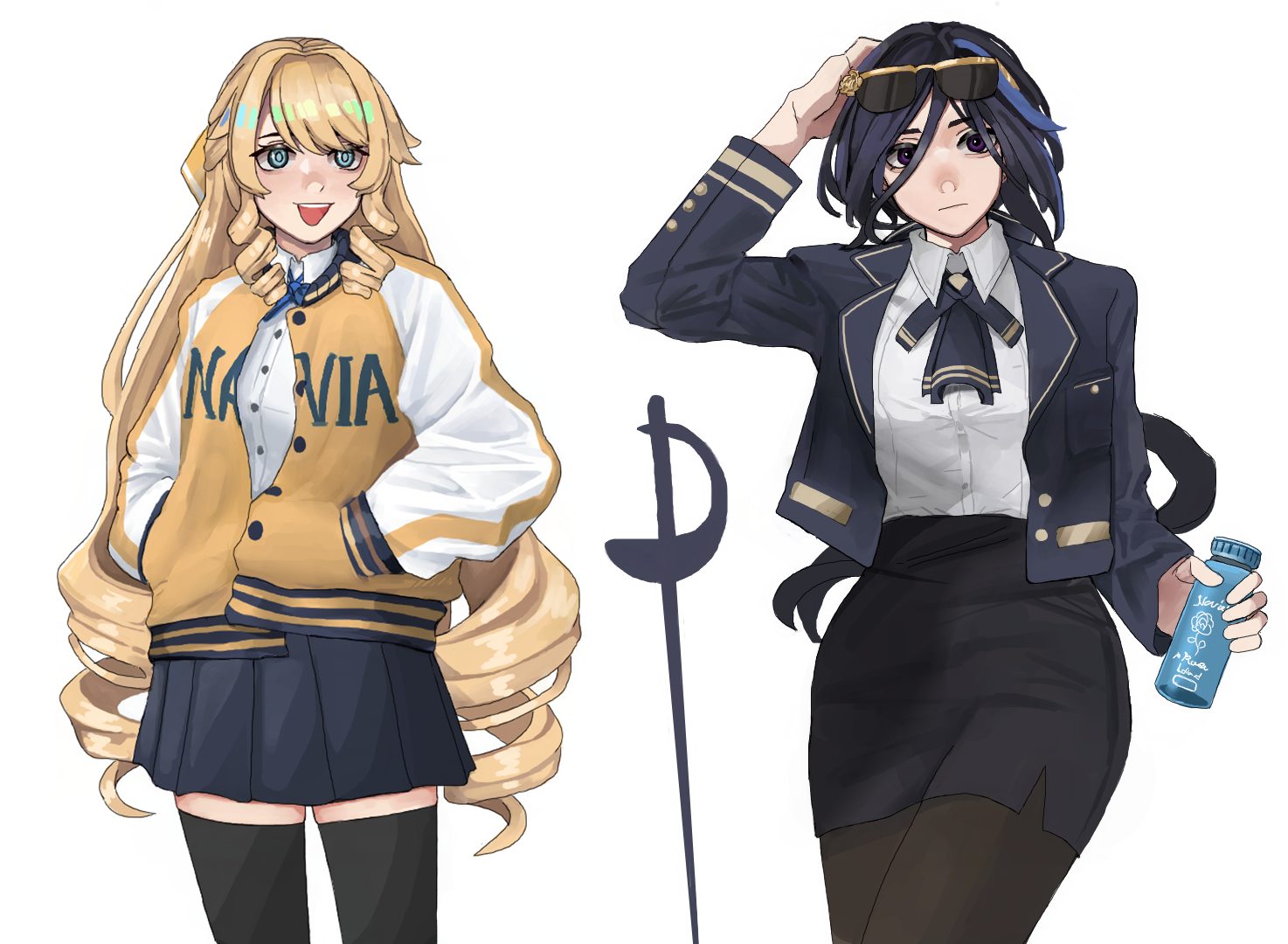 2girls :d alternate_costume arm_up black_hair black_skirt black_thighhighs blonde_hair blue_eyes blue_jacket blue_skirt capkal character_name clorinde_(genshin_impact) clothes_writing commentary cowboy_shot drill_hair drill_sidelocks eyewear_on_head genshin_impact hands_in_pockets jacket long_hair miniskirt multiple_girls navia_(genshin_impact) missing_headwear open_clothes open_jacket open_mouth pantyhose pencil_skirt pleated_skirt purple_eyes rapier shirt sidelocks simple_background skirt smile standing sunglasses sword thighhighs very_long_hair weapon white_background white_shirt zettai_ryouiki