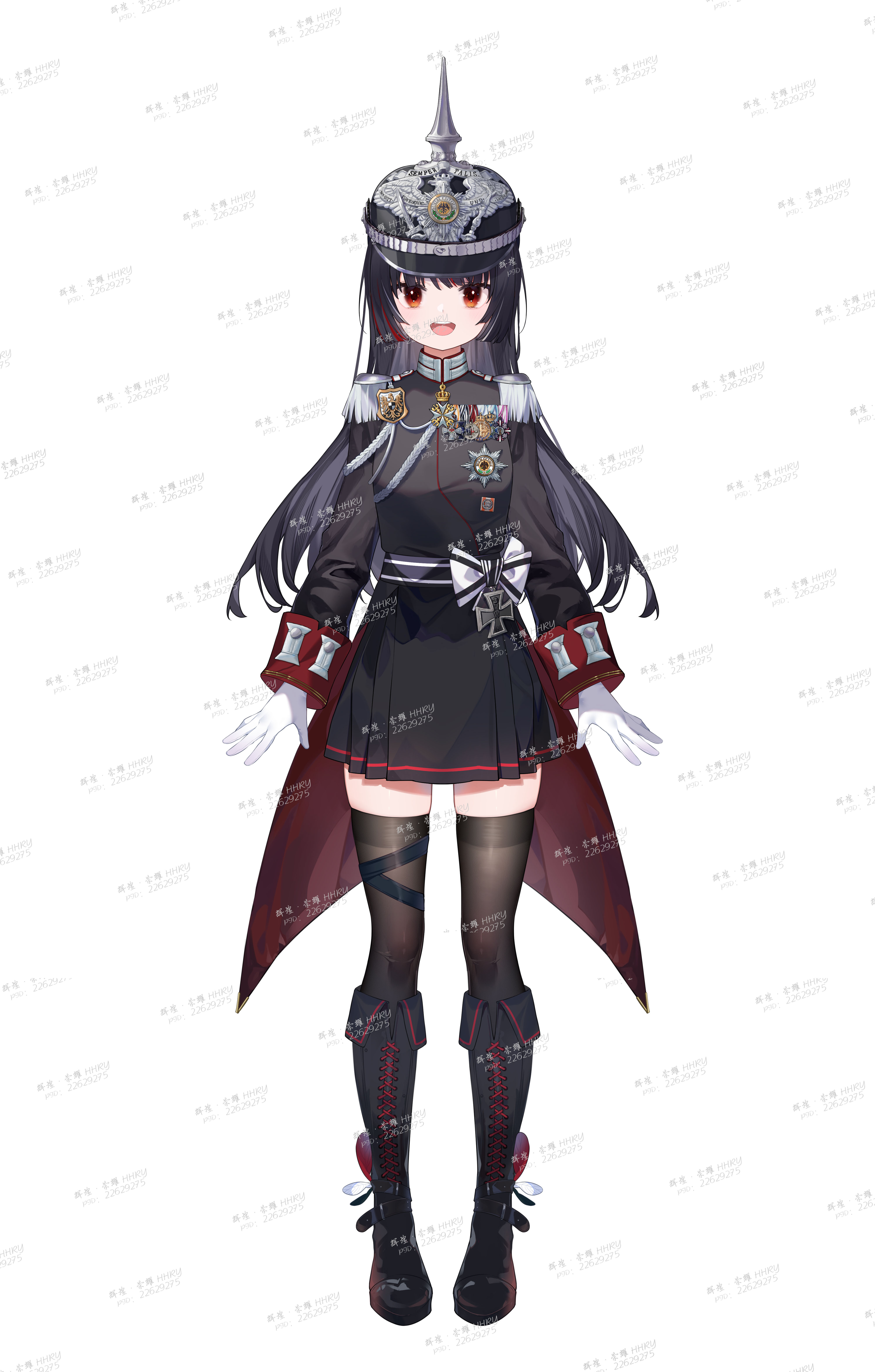 1girl :d absurdres aiguillette belt belt_bow black_belt black_boots black_hair black_headwear black_jacket black_skirt black_thighhighs boots bow character_request combat_helmet copyright_request cross epaulettes fold-over_boots full_body german_empire gloves helmet high_collar highres huihuang_rongyao iron_cross jacket knee_boots lace-up_boots long_hair long_sleeves looking_at_viewer medal military_uniform miniskirt open_mouth pickelhaube pleated_skirt red_eyes skindentation skirt smile solo standing tachi-e teeth thigh_belt thigh_strap thighhighs upper_teeth_only virtual_youtuber water watermark watermark_grid white_background white_bow white_gloves zettai_ryouiki