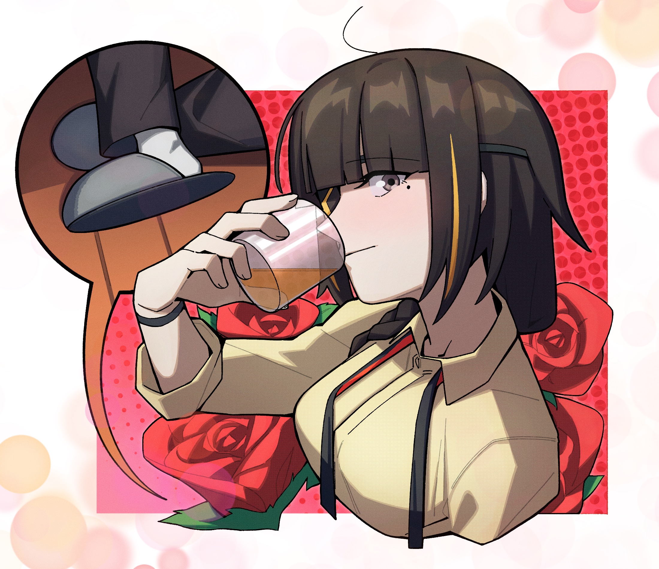 alcohol braid brown_eyes brown_hair cup drinking emile_aoi eyepatch flower girls'_frontline highres long_hair m16a1_(girls'_frontline) mole mole_under_eye multicolored_hair necktie red_flower red_rose rose shirt slippers socks solo watch white_socks wine yellow_shirt