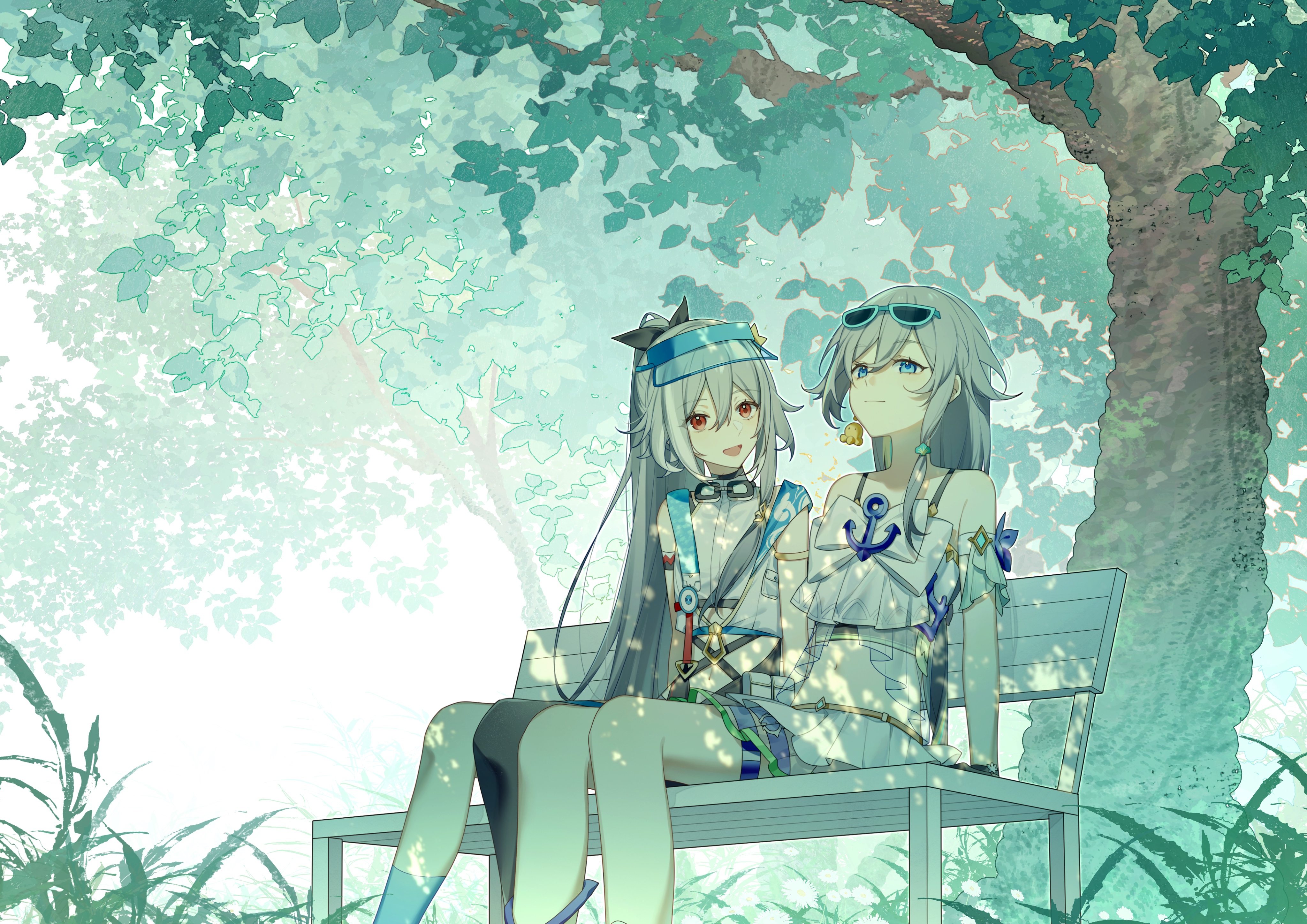 2girls absurdres anchor_ornament asymmetrical_legwear bare_legs bare_shoulders bikini black_bow black_choker black_shorts black_thighhighs blonde_hair blue_eyes blue_hair blue_headwear blue_socks bow chair choker closed_mouth dual_persona earrings eyewear_on_head forest fu_hua fu_hua_(seagull's_soar) fu_hua_(shadow_knight) goggles grass grey_hair hair_between_eyes hair_bow hair_ornament herrscher_of_sentience herrscher_of_sentience_(ooh!_summer!) high_ponytail highres honkai_(series) honkai_impact_3rd jewelry light_smile long_hair looking_at_another looking_up low-tied_long_hair low_ponytail multicolored_hair multiple_girls nature navel official_alternate_costume on_chair open_mouth outdoors ponytail rash_guard red_eyes saya_atang shirt short_shorts shorts single_leg_pantyhose single_thighhigh sitting skirt sleeveless smile socks star_(symbol) star_hair_ornament stomach streaked_hair summer sunglasses swimsuit thighhighs thighs torn_clothes torn_thighhighs tree uneven_legwear unworn_eyewear visor_cap white_bikini white_hair white_shirt white_skirt wooden_chair