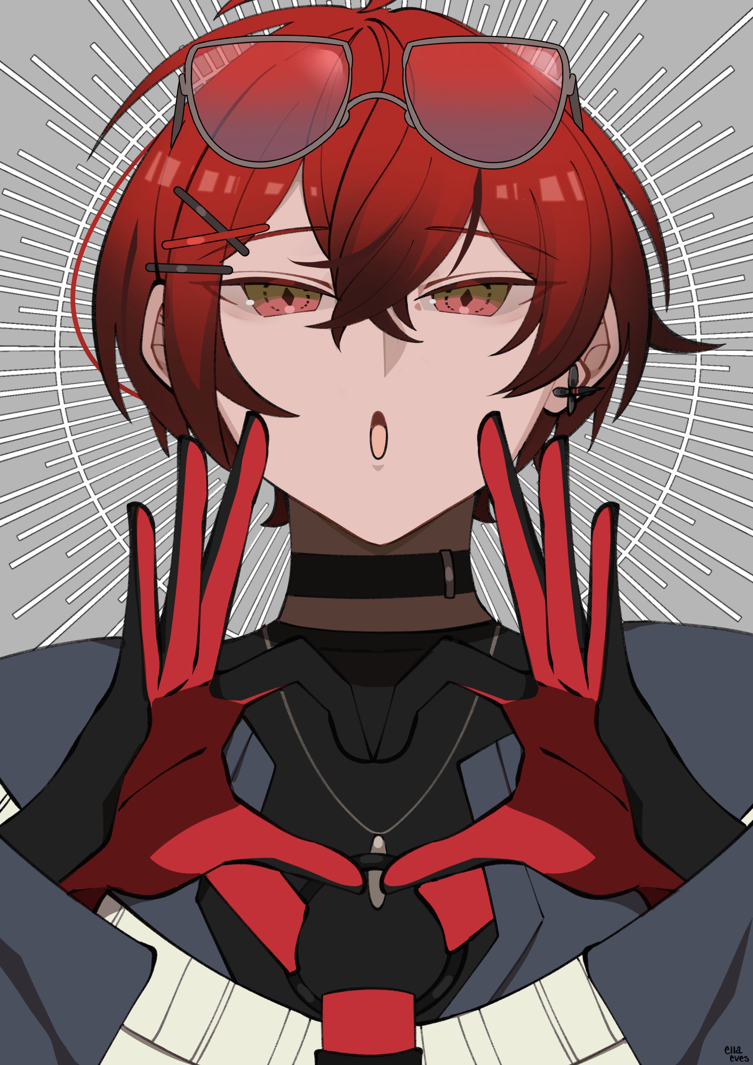 1boy absurdres black_choker black_gloves black_hair choker commentary diamond-shaped_pupils diamond_(shape) earrings ella_eves english_commentary eyewear_on_head facing_viewer gloves gradient_hair grey_background hair_between_eyes hairpin heart heart_hands highres holostars holostars_english jewelry machina_x_flayon machina_x_flayon_(2nd_costume) male_focus multicolored_hair multiple_hairpins necklace o-ring_strap open_mouth red_eyes red_gloves red_hair short_hair solo sunglasses symbol-shaped_pupils two-tone_gloves upper_body virtual_youtuber