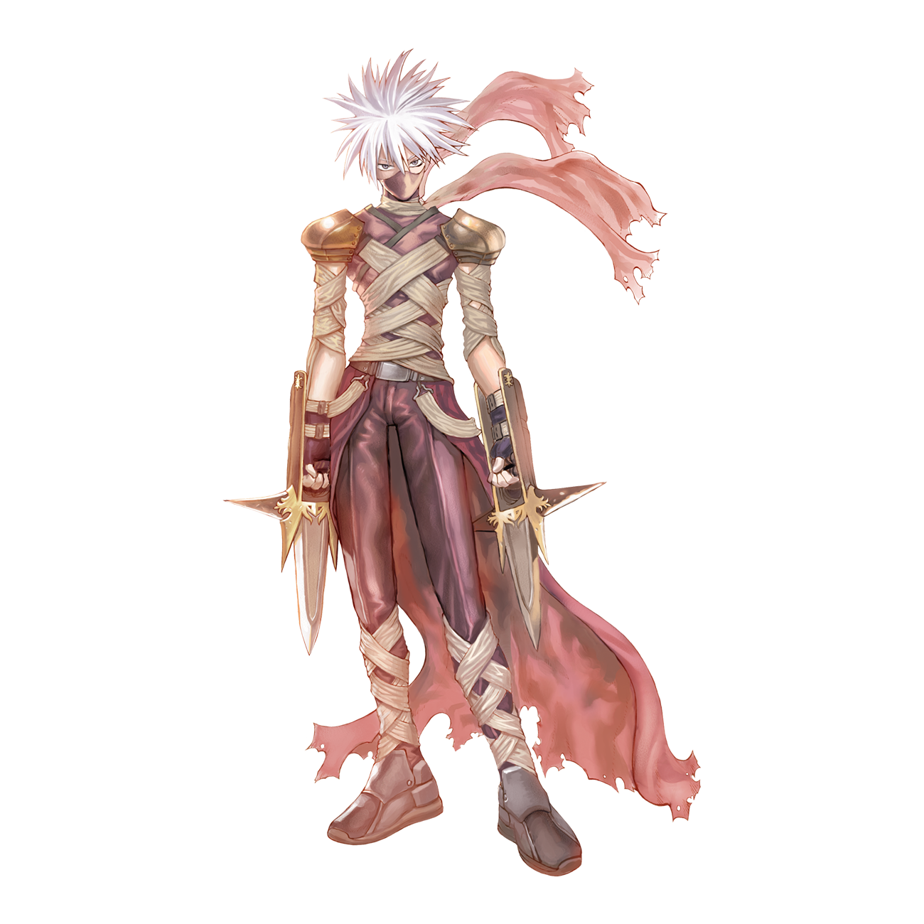 1boy 2000s_(style) armor assassin_(ragnarok_online) bandages brown_shoes cape capelet dagger dual_wielding full_body hair_between_eyes highres holding holding_dagger holding_knife holding_weapon jamadhar knife long_bangs looking_at_viewer male_focus mask mouth_mask myung-jin_lee ninja_mask official_art pants pauldrons pink_capelet pink_scarf purple_pants purple_shirt ragnarok_online scarf shirt shoes short_hair shoulder_armor simple_background sleeveless sleeveless_shirt solo spiked_hair standing tachi-e torn_cape torn_clothes torn_scarf transparent_background waist_cape weapon white_hair