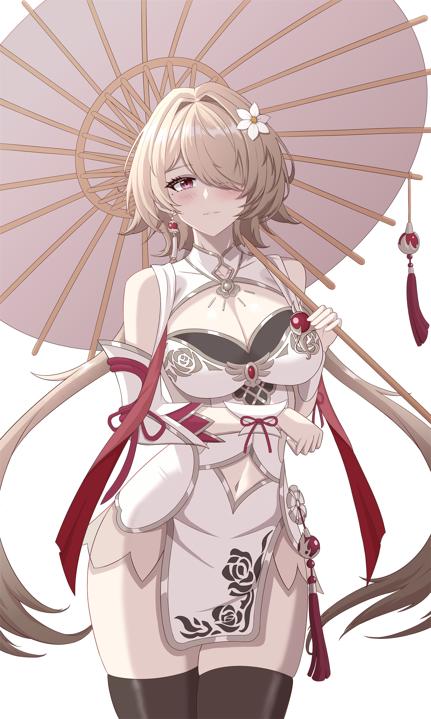 1girl absurdres black_pantyhose black_thighhighs blush breasts brown_hair china_dress chinese_clothes cleavage_cutout clothing_cutout detached_sleeves dress earrings floating_hair floral_print flower hair_between_eyes hair_flower hair_ornament hair_over_one_eye highres holding holding_umbrella honkai_(series) honkai_impact_3rd jewelry large_breasts long_bangs navel navel_cutout oil-paper_umbrella pantyhose red_eyes rita_rossweisse rita_rossweisse_(argent_knight:_artemis) rita_rossweisse_(maid_of_celestia) short_hair simple_background single_earring smile solo thighhighs twintails umbrella white_background zc007
