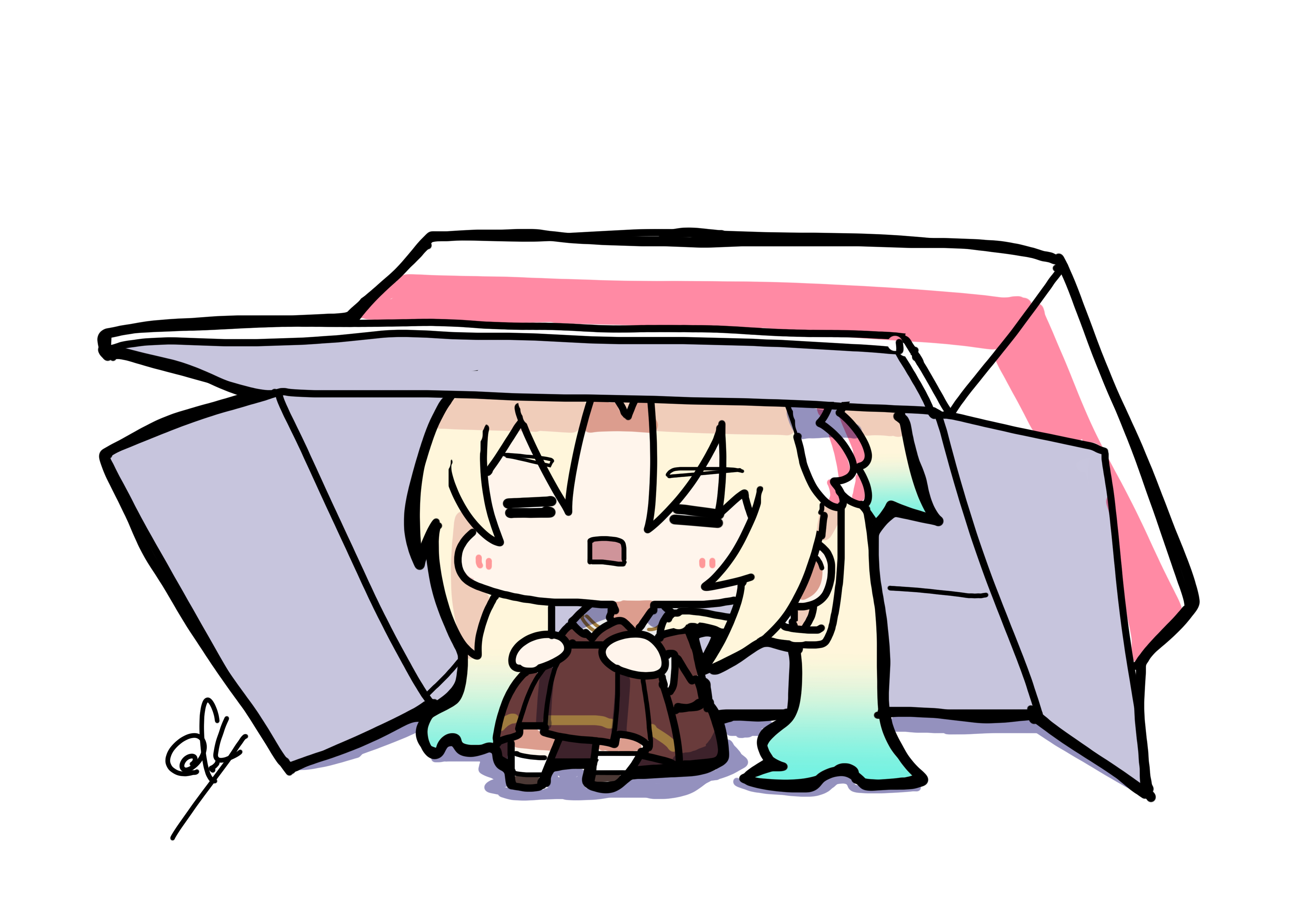 1girl absurdres aqua_hair blonde_hair box cardboard_box chibi chibi_only closed_eyes facing_viewer flower gradient_hair hair_flower hair_ornament hands_on_own_knees hasu_no_sora_school_uniform highres knees_up link!_like!_love_live! long_hair long_sleeves love_live! multicolored_hair multiple_girls on_floor oofushi_ao open_mouth osawa_rurino rectangular_mouth sailor_collar school_uniform shadow sidelocks signature sitting solo twintails under_box