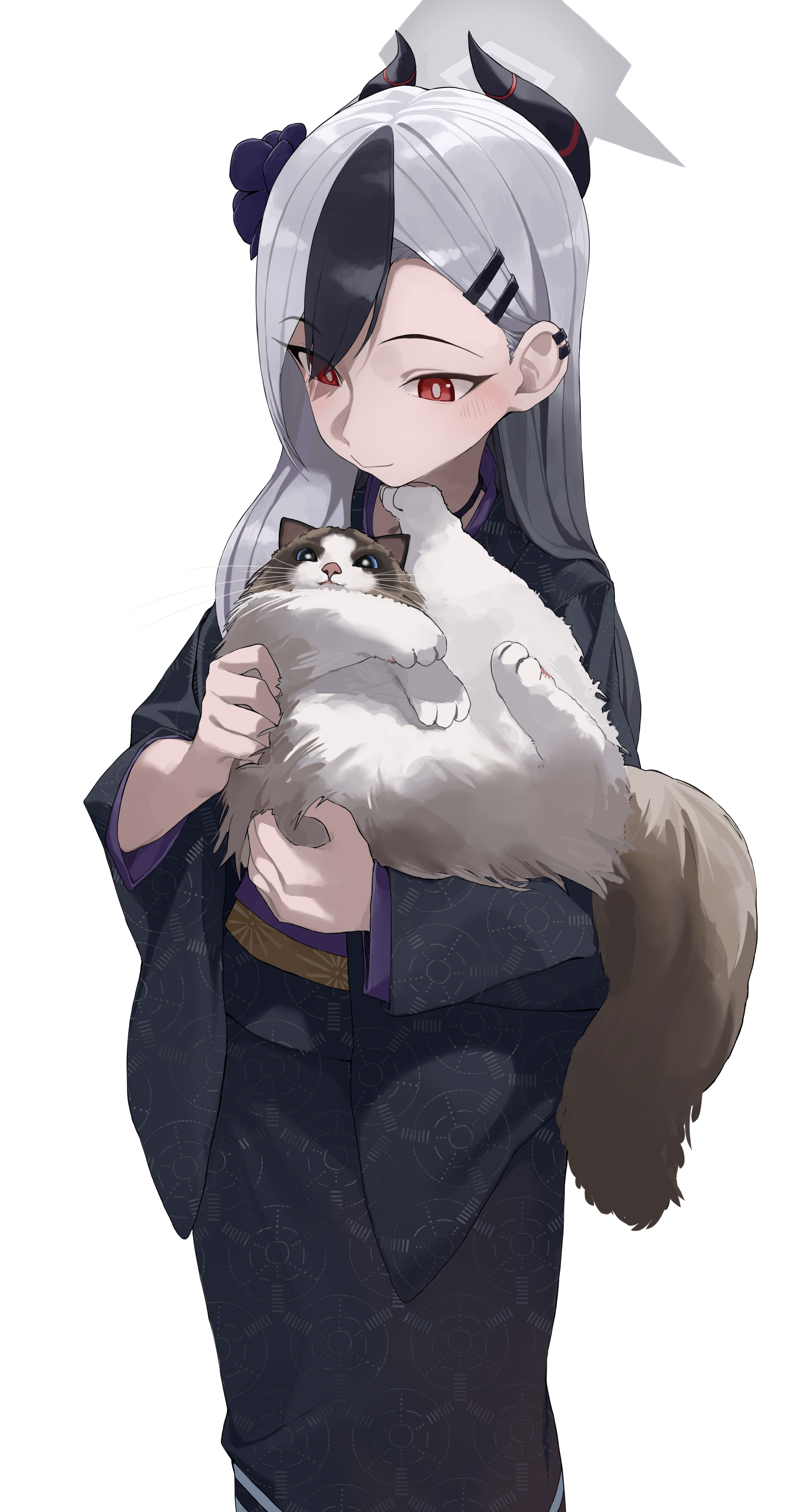 1girl absurdres animal black_hair black_kimono blue_archive cat ear_piercing grey_hair hair_behind_ear hair_ornament hairclip halo highres holding holding_animal holding_cat horns japanese_clothes kayoko_(blue_archive) kayoko_(new_year)_(blue_archive) kimono long_hair long_sleeves looking_at_animal multicolored_hair piercing simple_background solo standing streaked_hair white_background zhihuigugudegezi