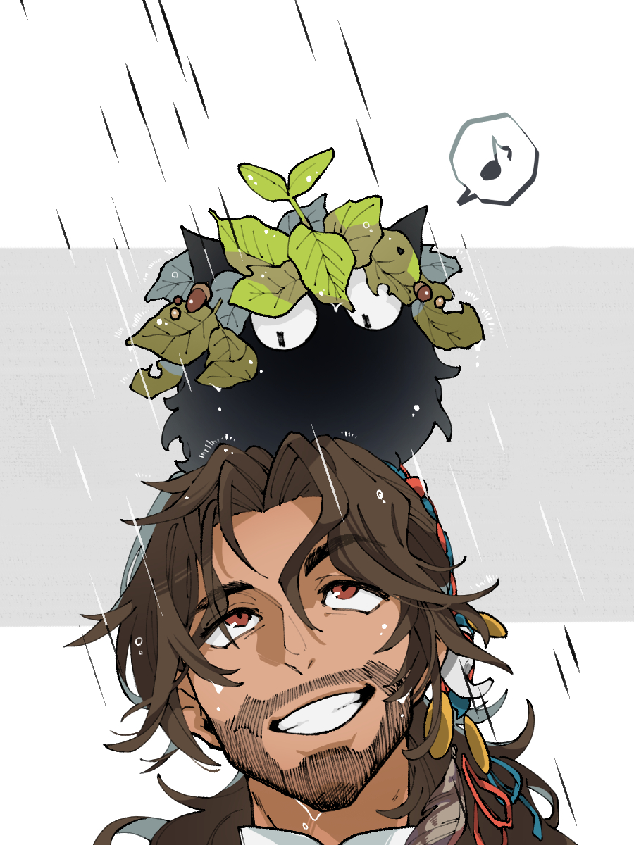 1boy beard_stubble brown_eyes brown_hair carbuncle_(reverse:1999) creature creature_on_head dark-skinned_male dark_skin desi eighth_note facial_hair facing_viewer grey_background grin hair_ornament head_tilt highres kaeru_(uj26cobrsv) leaf leaf_on_head long_hair looking_at_another looking_down looking_up male_focus mature_male musical_note portrait rain reverse:1999 shamane smile solo spoken_musical_note stubble teeth two-tone_background white_background
